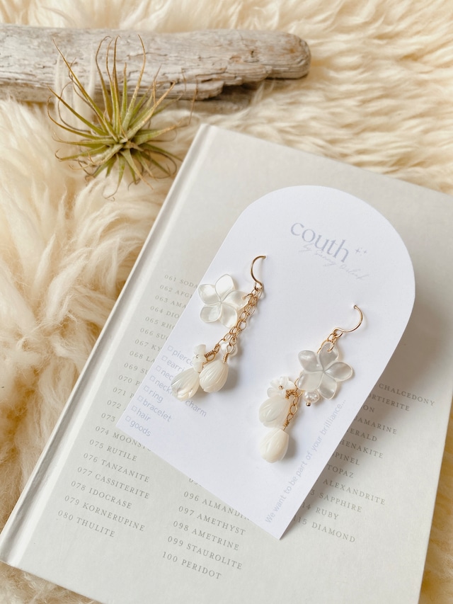 2025 Spring Edition ◆金属すべて14KGF ◆マザーオブパール ◆ホワイトシェル ◆淡水パール かわいいと感じたパーツをふんだんに使った、花いっぱいの豪華なピアス。ホワイトゴールドで子どもっぽさを減らし、人工樹脂とは異なる天然石の輝きが存分に活かされるようにチェーンでゆらゆらときらめく耳元になるように製作いたしました。ジャスミンやプルメリアを連想するハワイアンなジュエリーは、自分を洗練した気分にさせてくれることに間違いありません。 ◎ピアス部分含め金属はすべて14KGFを使用しております。但しイヤリングの場合、イヤリング部分のみメッキになります。 ◎送料は無料です。クリックポストにて発送いたします。 ◎ハンドメイド作品のため、衝撃には弱いです。破損など怪我の原因となりますので、ご使用の際は強い力をかけないようご注意くださいませ。 ◎天然石を使用している為、天然石の形にわずかな違いがある場合がございます。ご了承くださいませ。 ◎商品とは別添えで写真のアクセサリー保管ケースをお付けしております。(goods.necklace charmを除く)