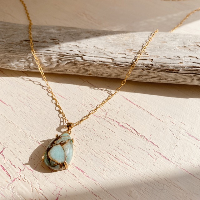 コッパーアマゾナイトネックレス(14KGF) "Florence"(フローレンス) ◆14KGFチェーン ◆ペンダント素材Silver925(18KGP加工) ◆コッパーアマゾナイト(石言葉:希望) ◆約50cm アマゾナイトはホープストーンと呼ばれる石です✨コッパー(銅)で金継ぎのように加工されたアマゾナイトがおしゃれなネックレス。ロングチェーンで、厚手の服の上からでも着けられます◎ ◎送料は無料です。ゆうパケットポストにて発送いたします。 ◎ハンドメイド作品のため、衝撃に弱いです。破損など怪我の原因となりますので、ご使用の際は強い力をかけないようご注意くださいませ。 ◎天然素材を使用しているため、模様や形が異なる場合がございます。