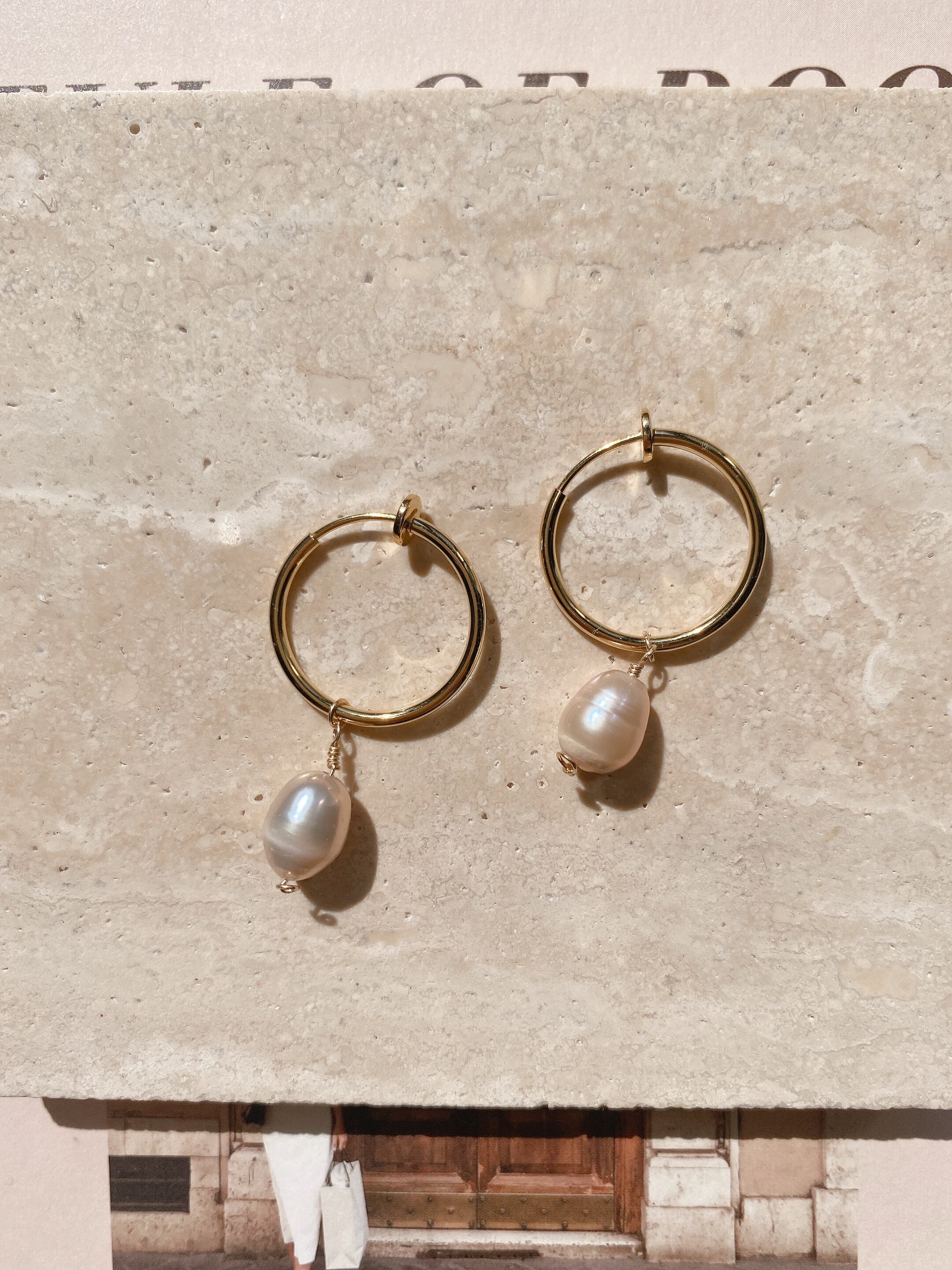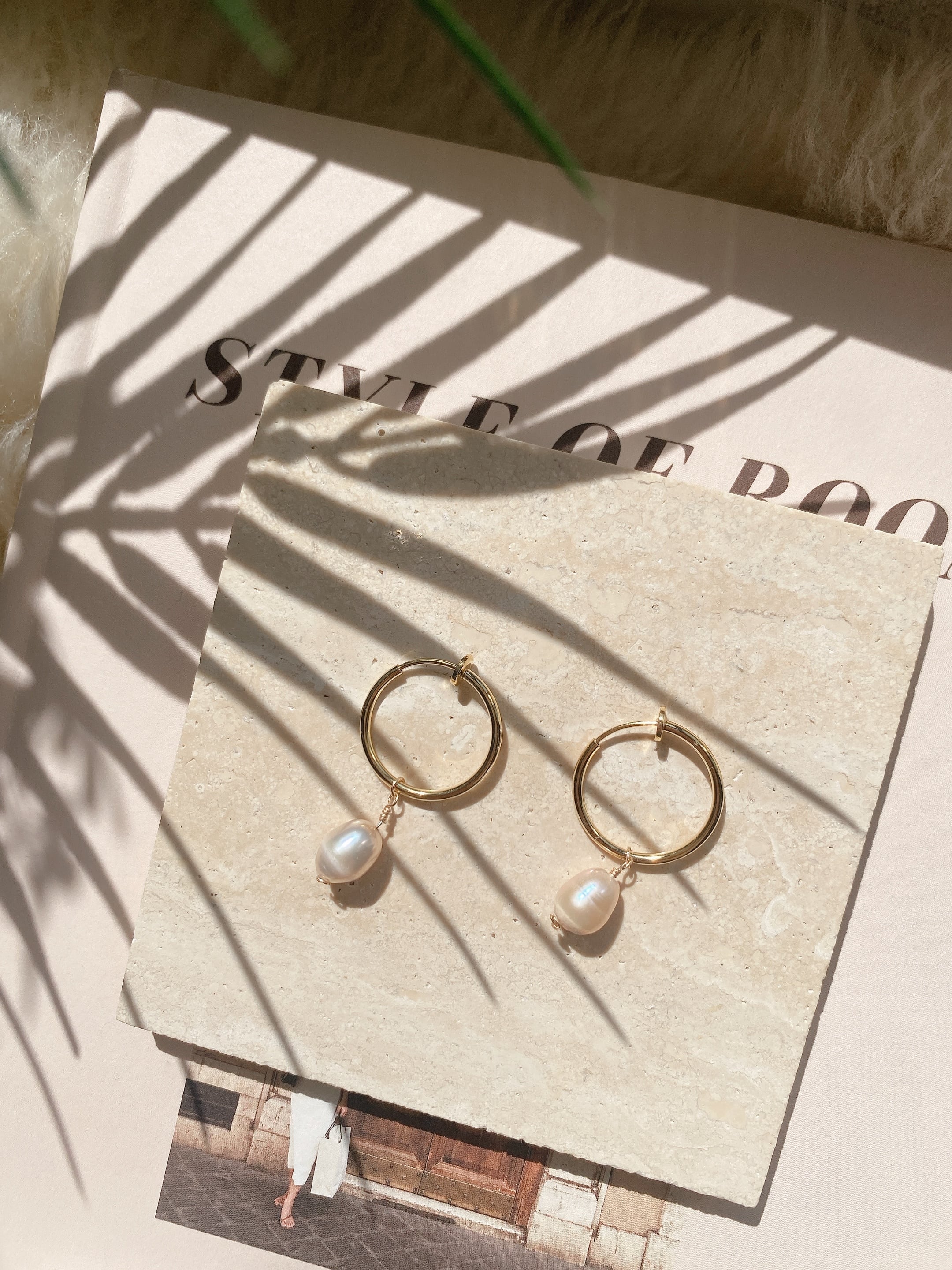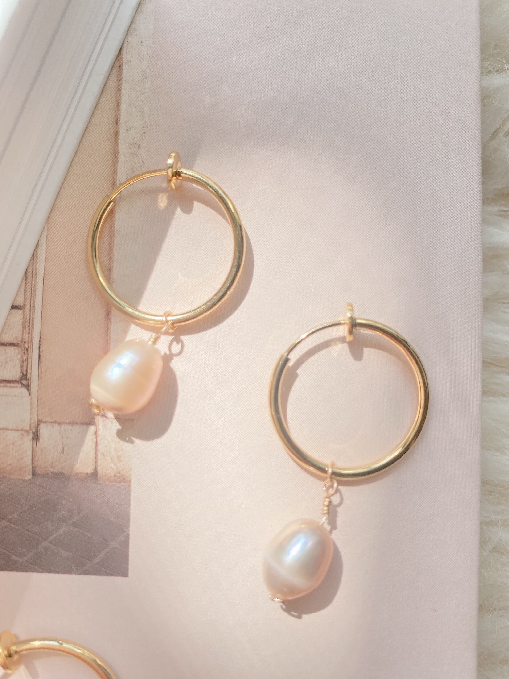 フープピアスに大き目淡水パールが着いたピアス。カジュアルなシーンでも着けやすく、イヤリングでも重過ぎないから耳が痛くなりにくいです♡ホワイトと2色展開。