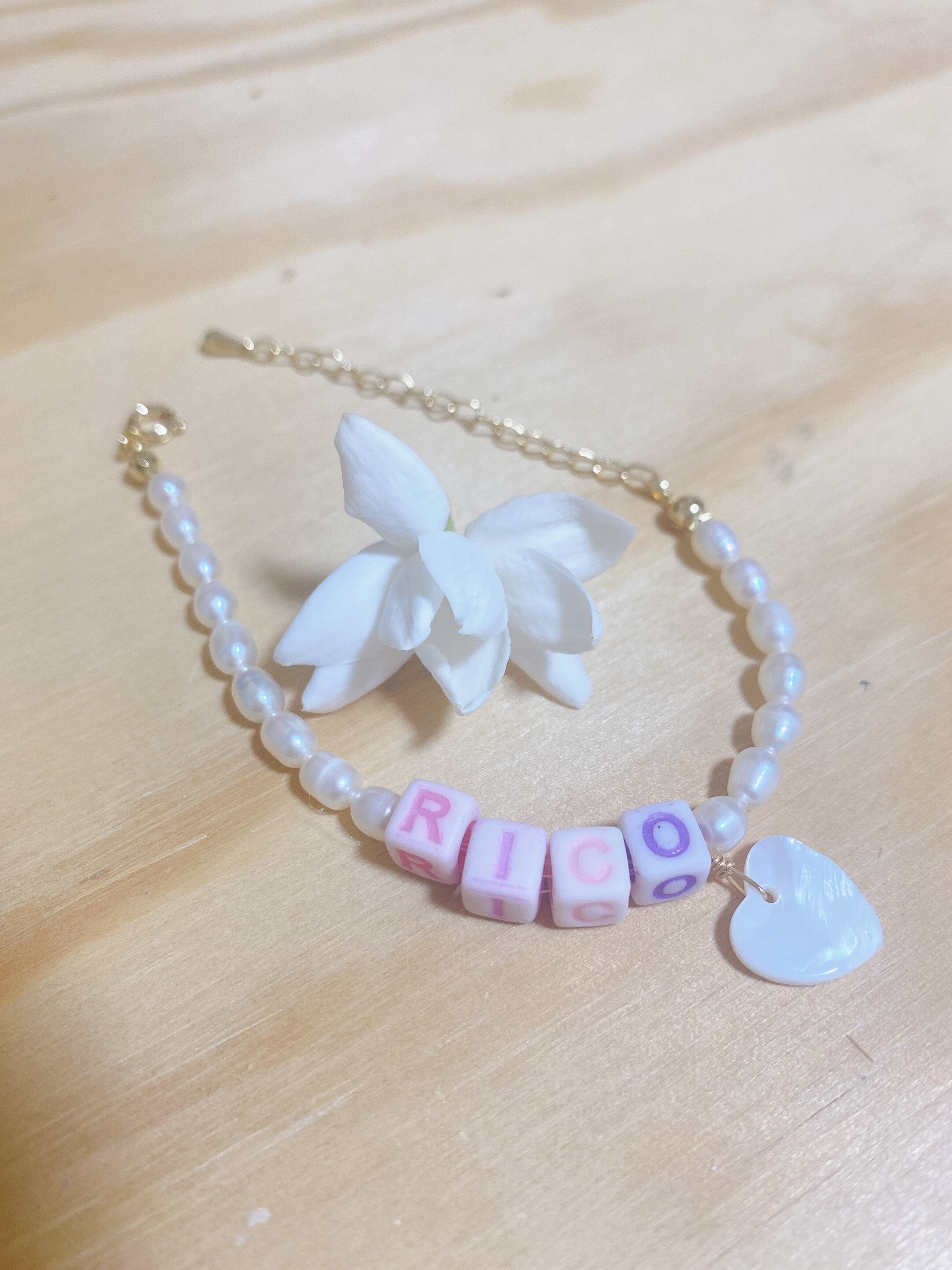 淡水パールと、淡いアルファベットが可愛らしいポップなネックレスです✨