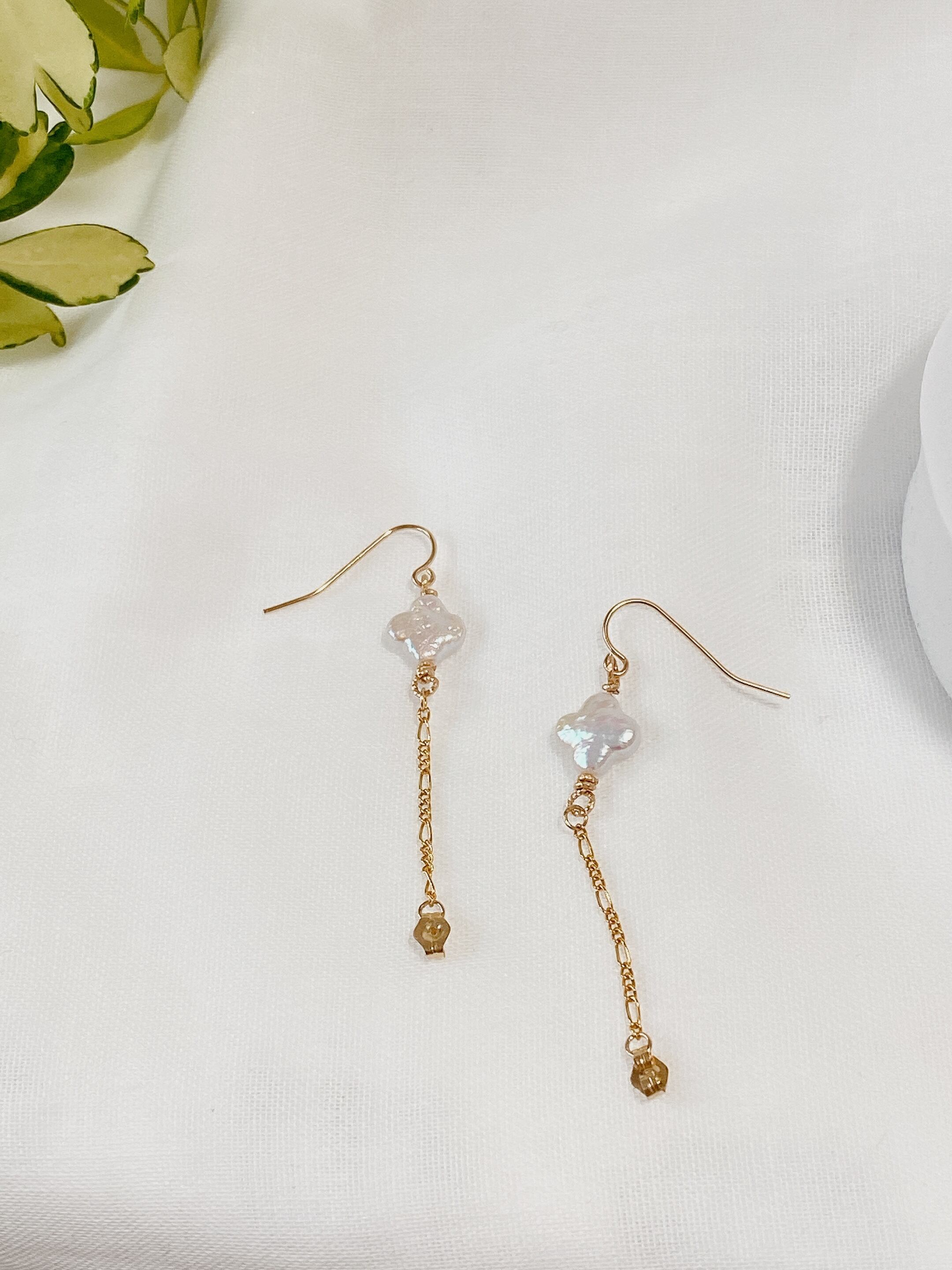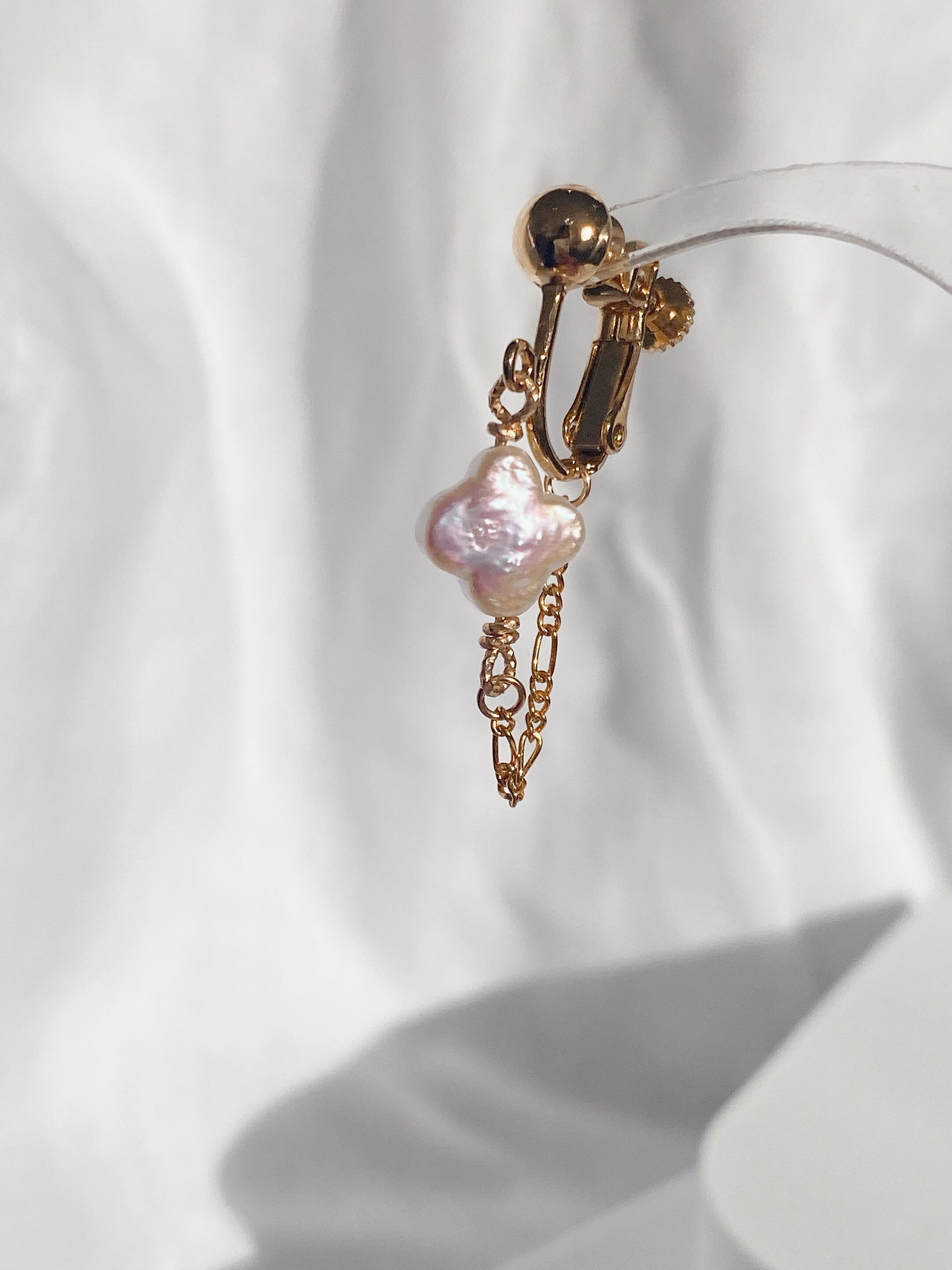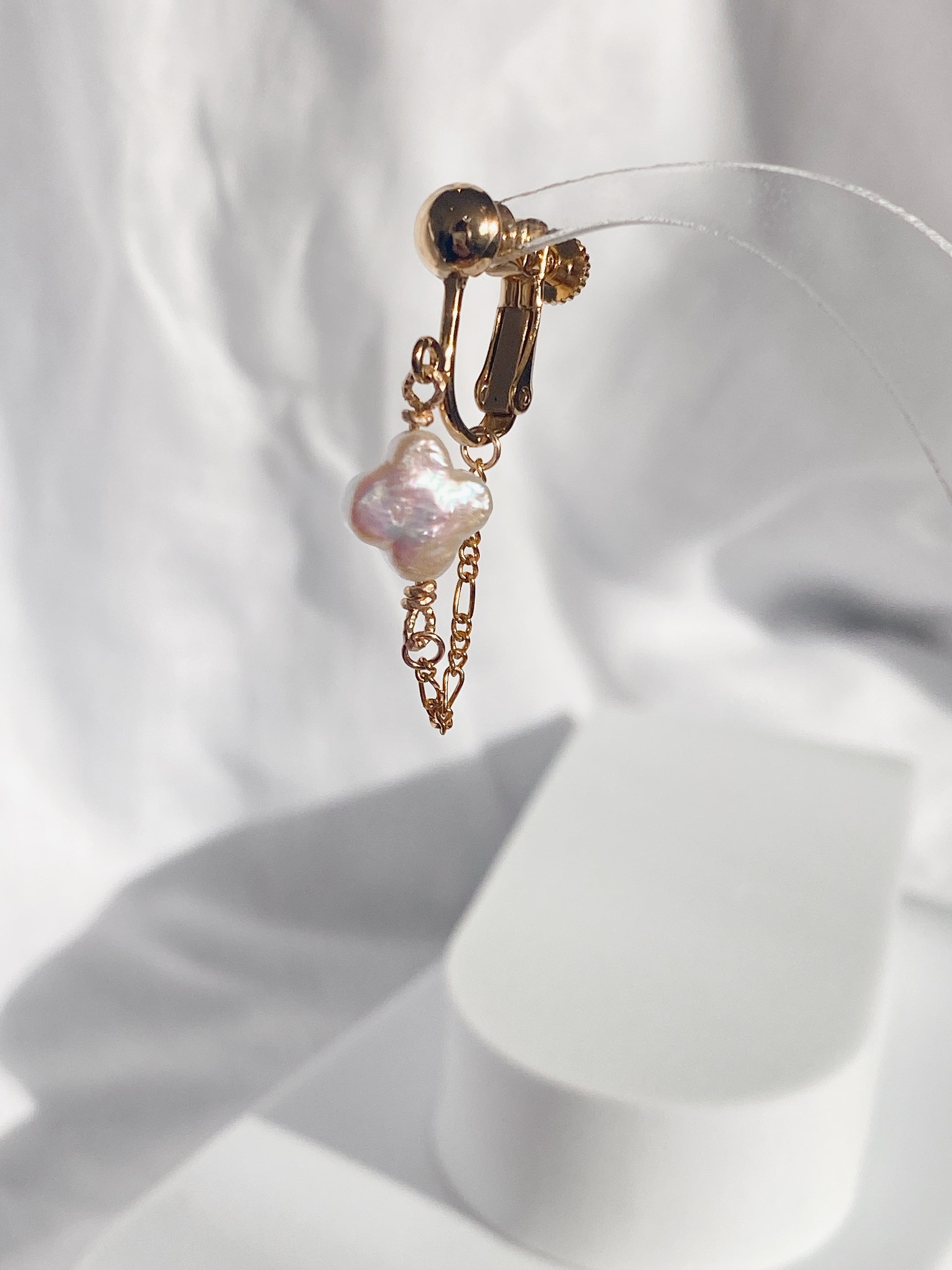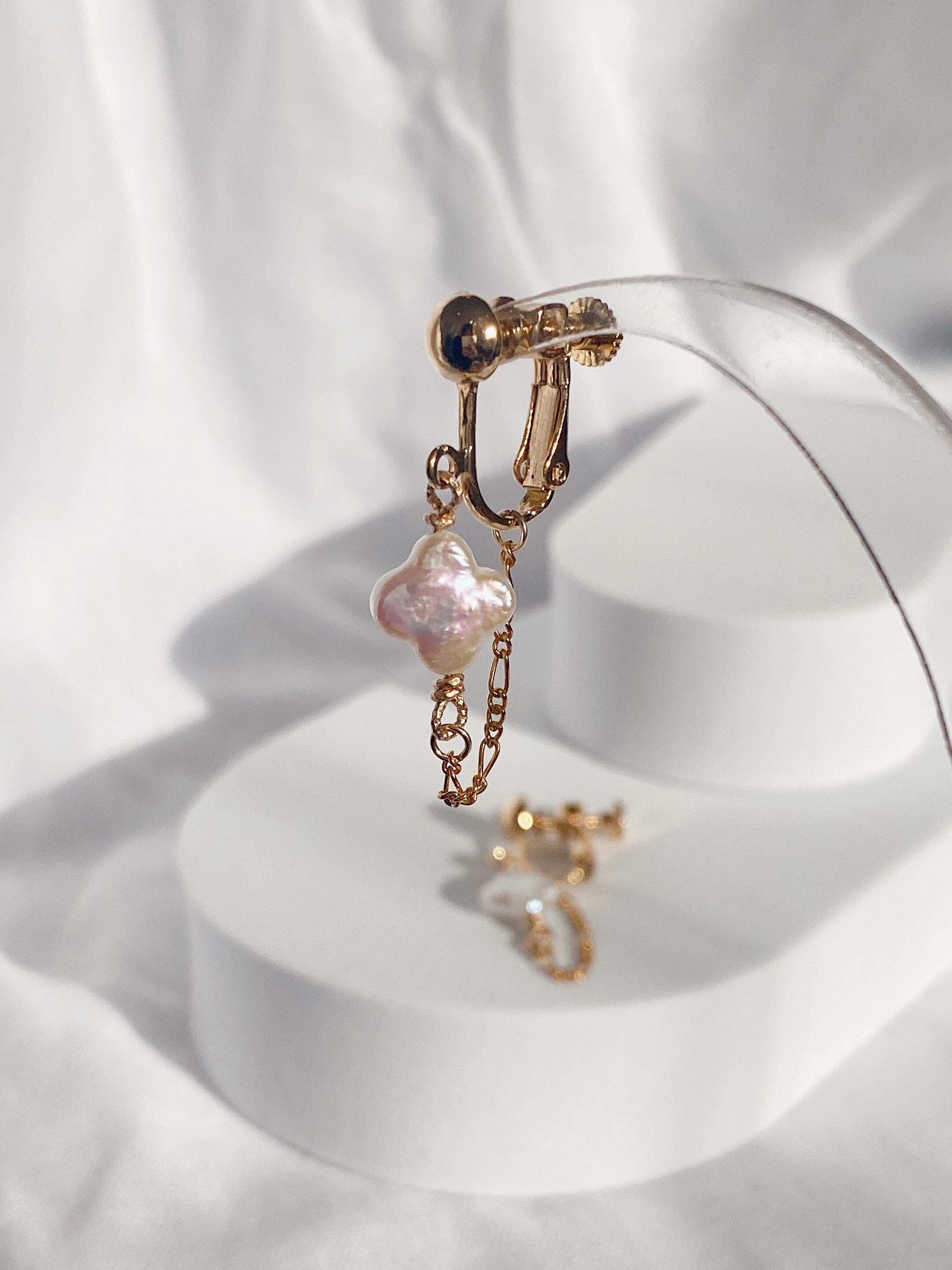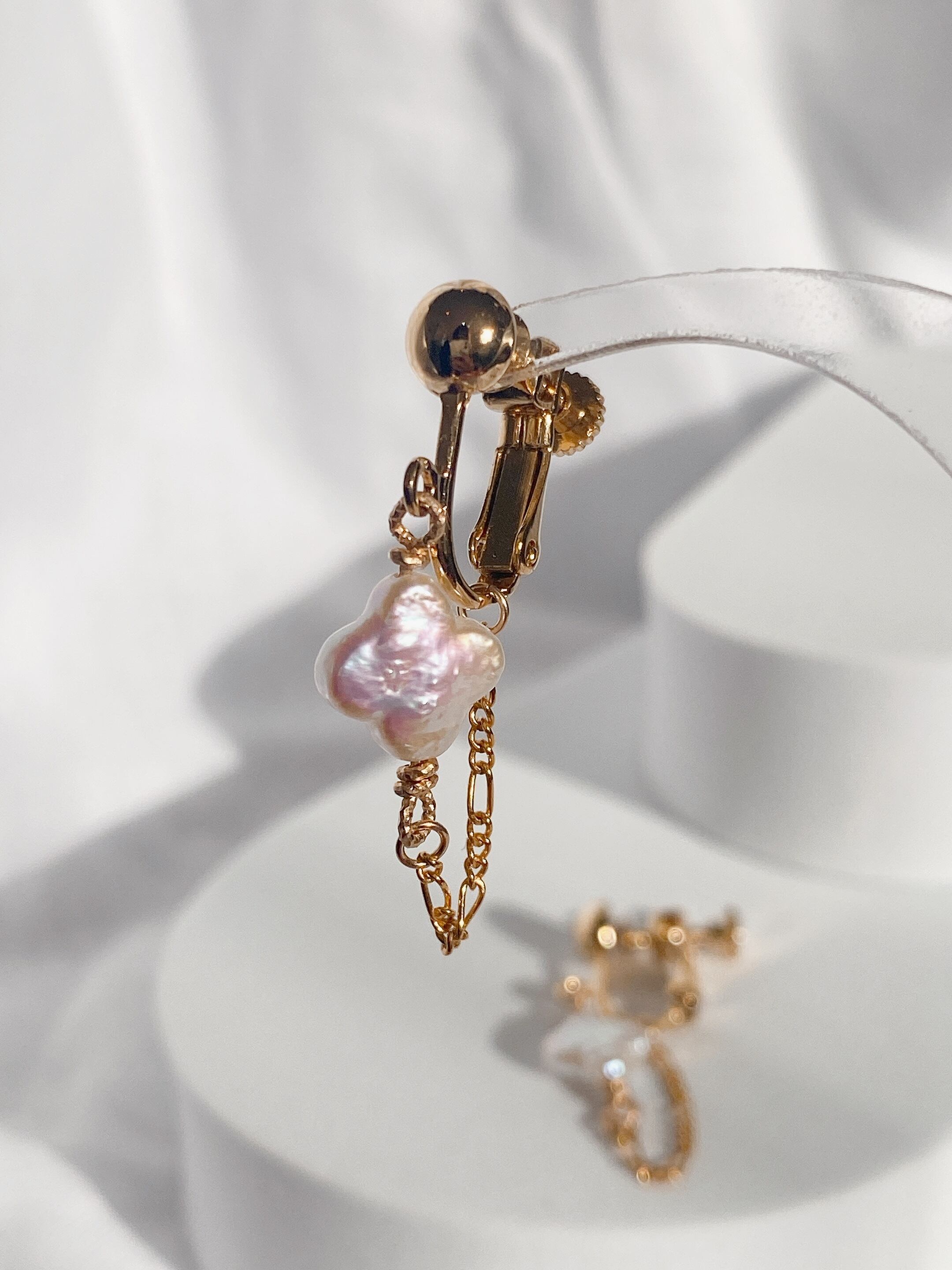 フラワーシェイプの淡水パールで耳元から旬な印象に。