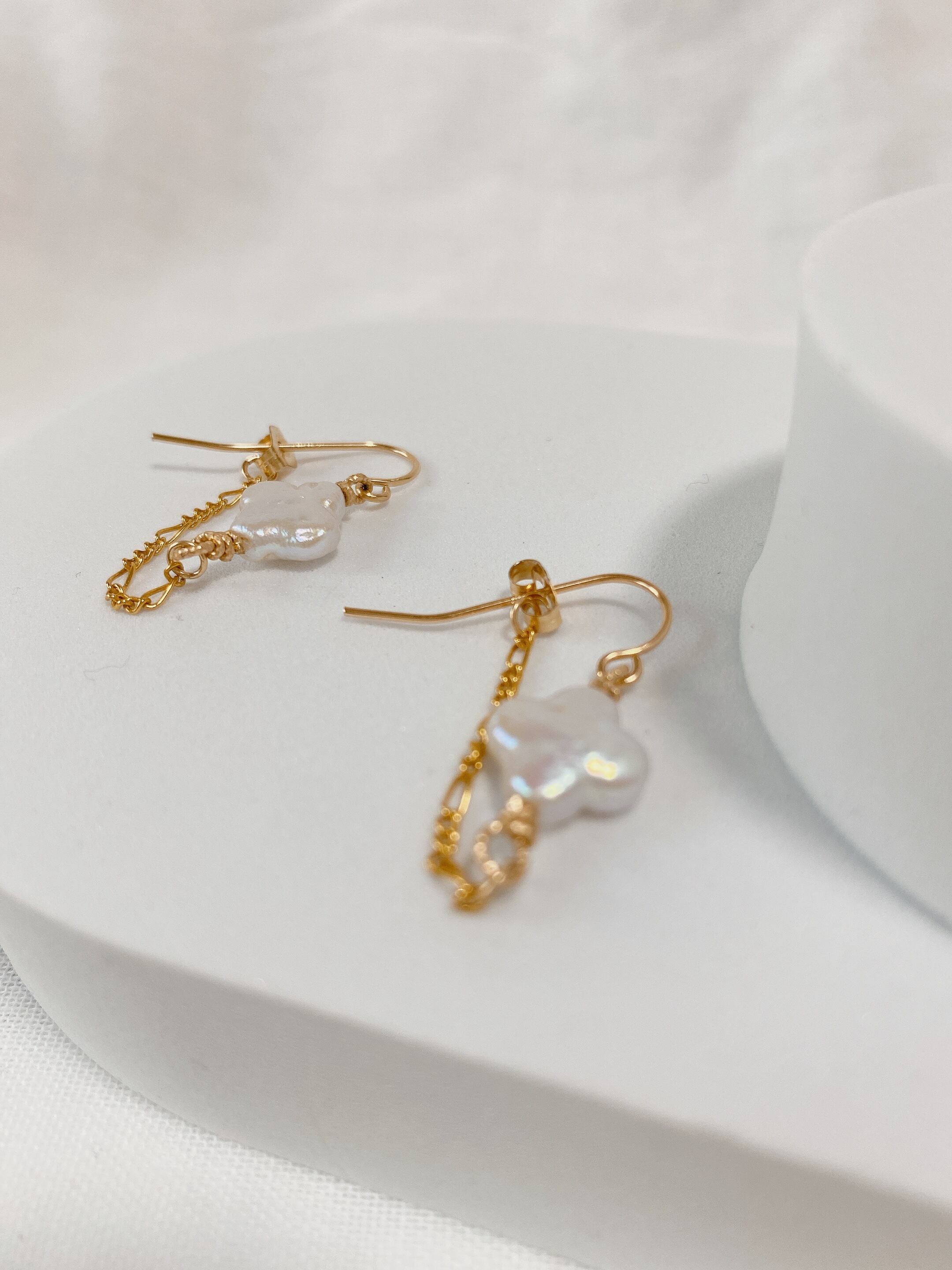 顔周りを明るくしてくれる純白の淡水パールと大人っぽく見せてくれるチェーンがポイント。