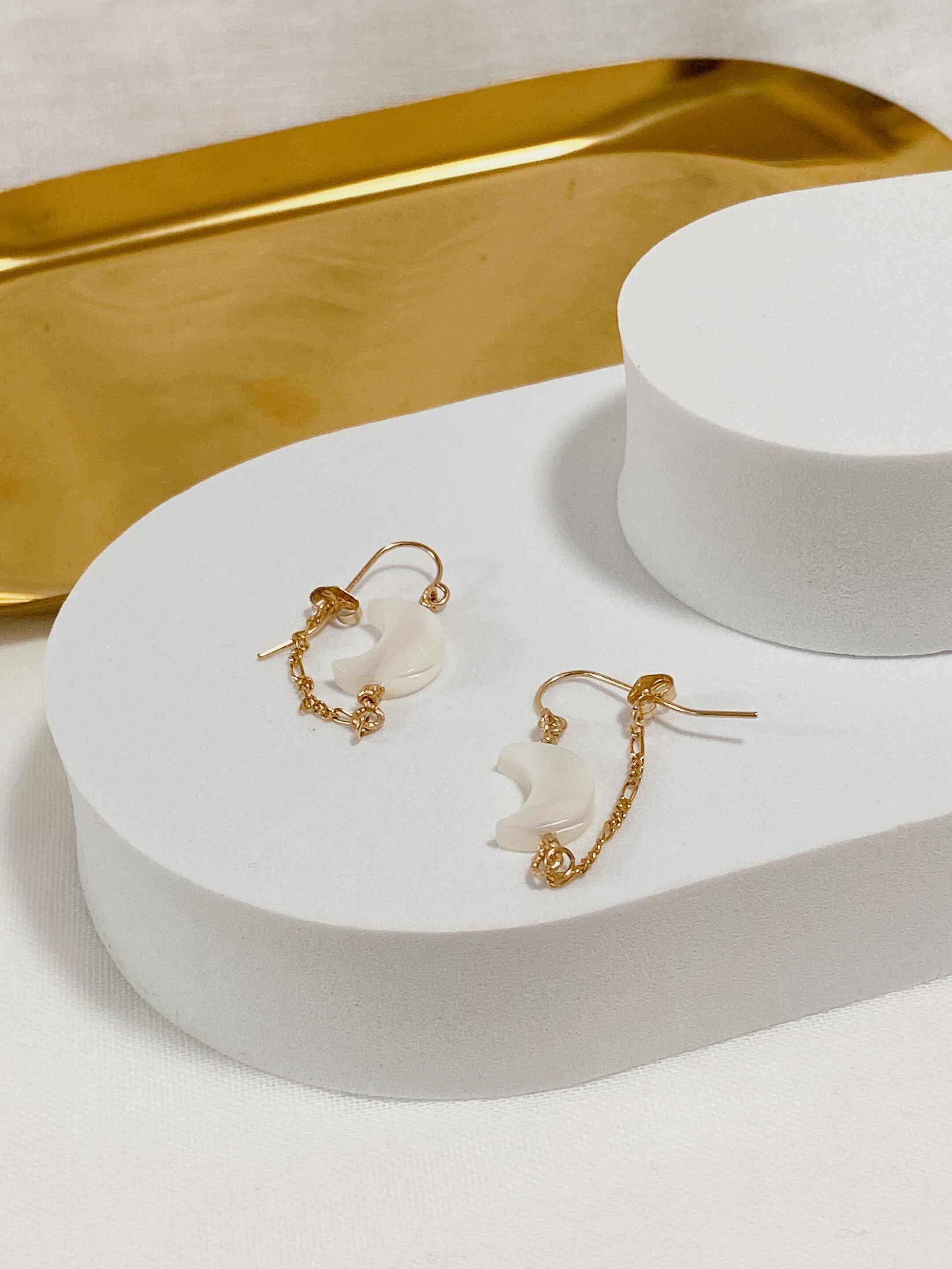 虹色の輝きを放つホワイトシェルと大人っぽく見せてくれるチェーンがポイント。