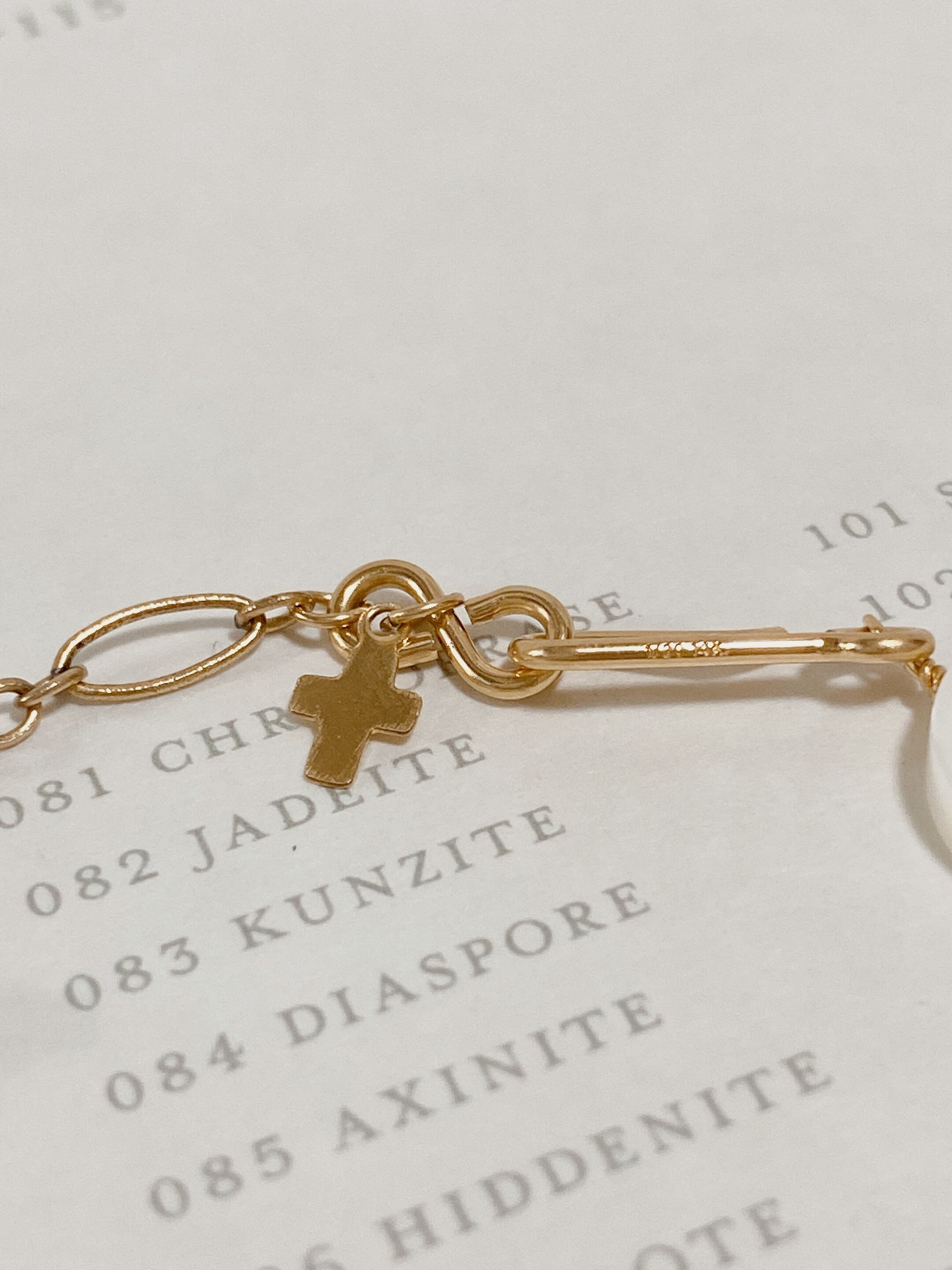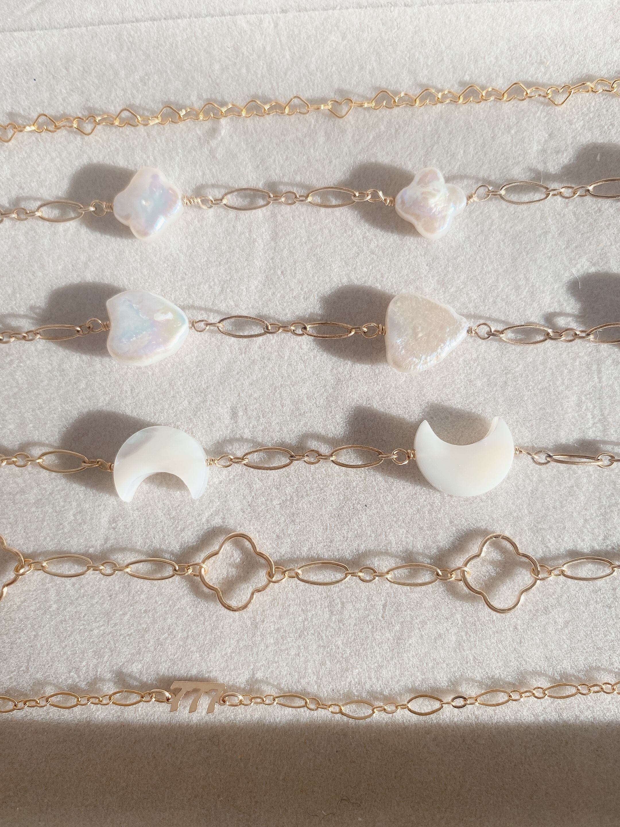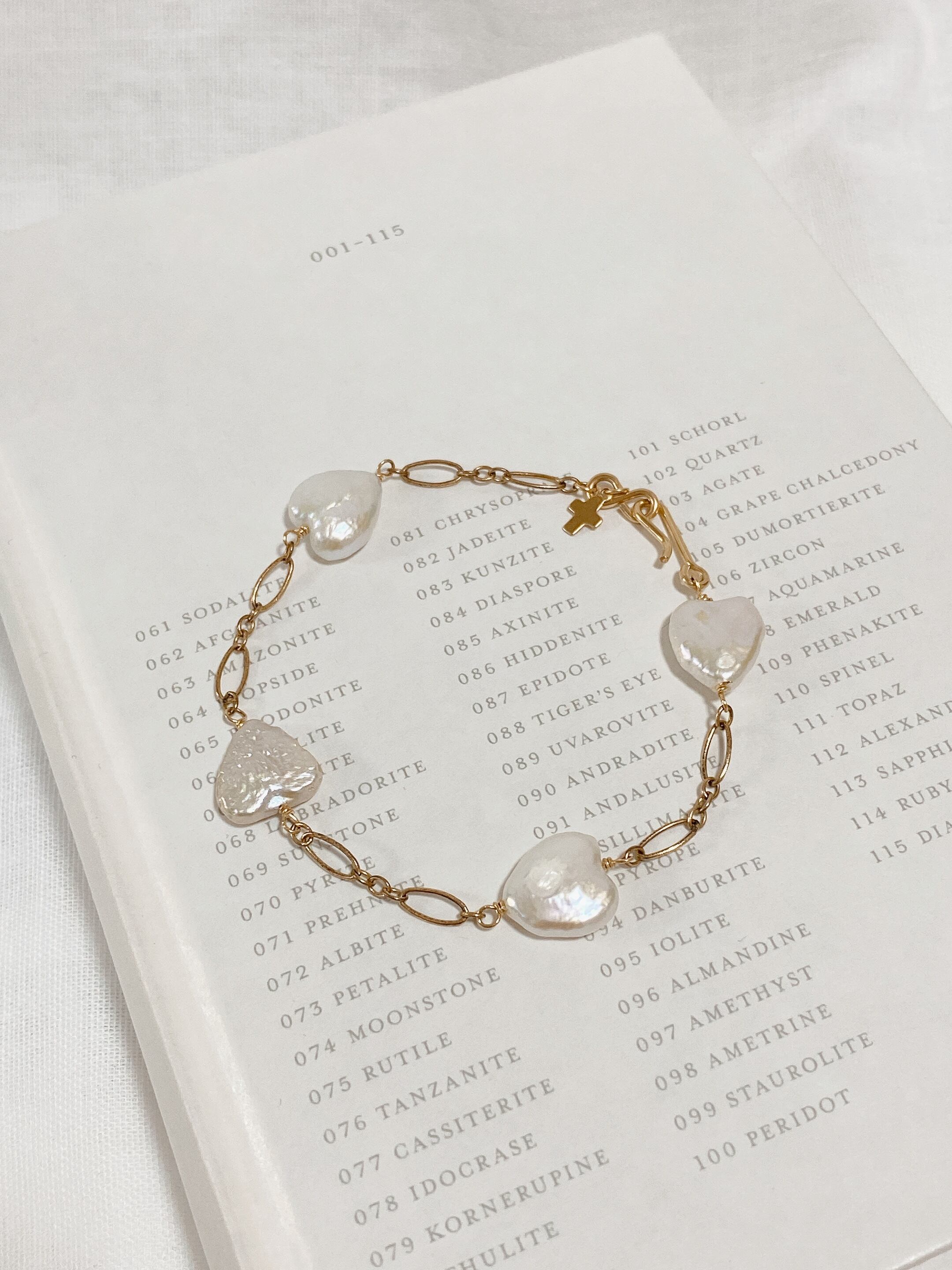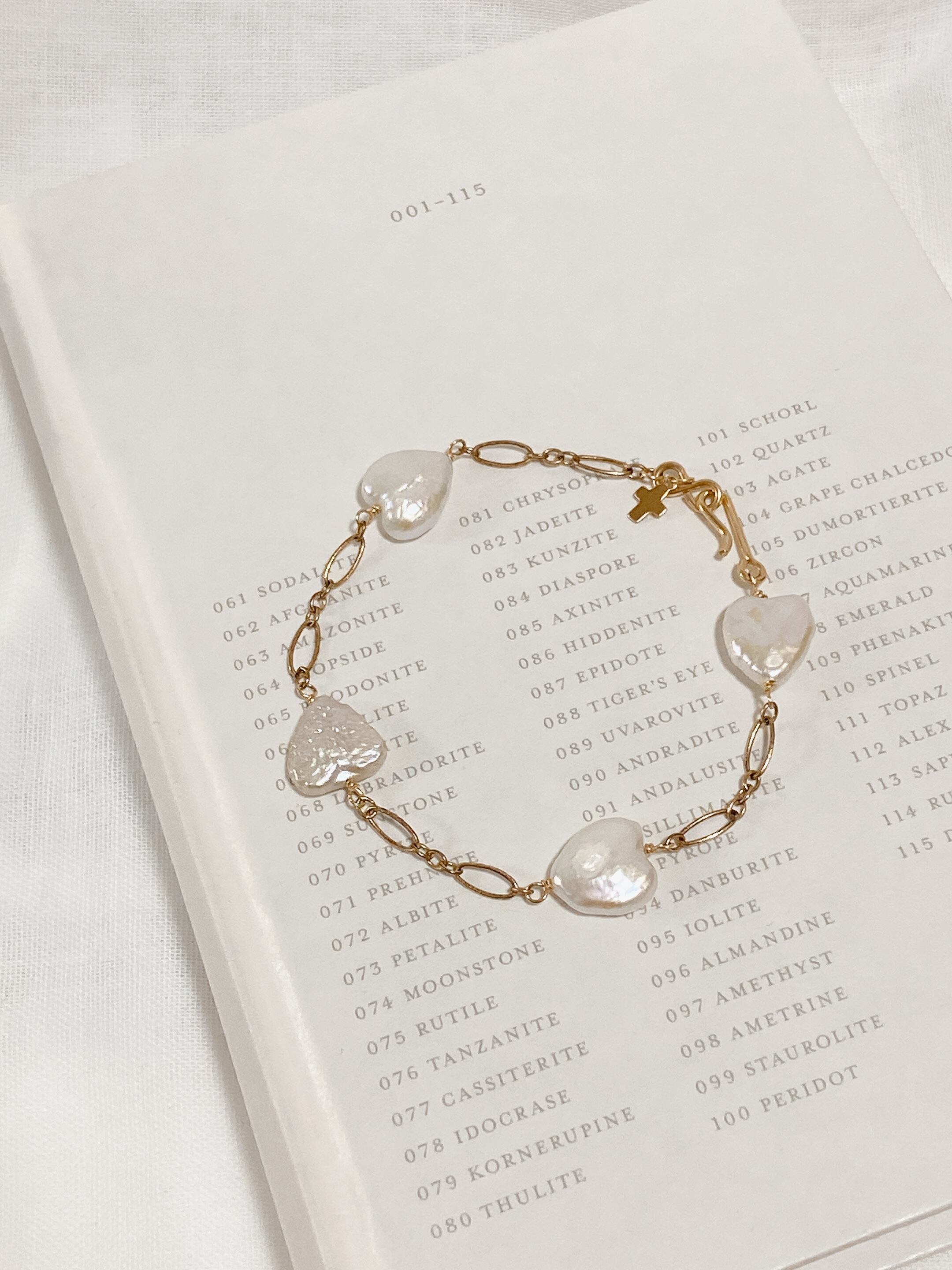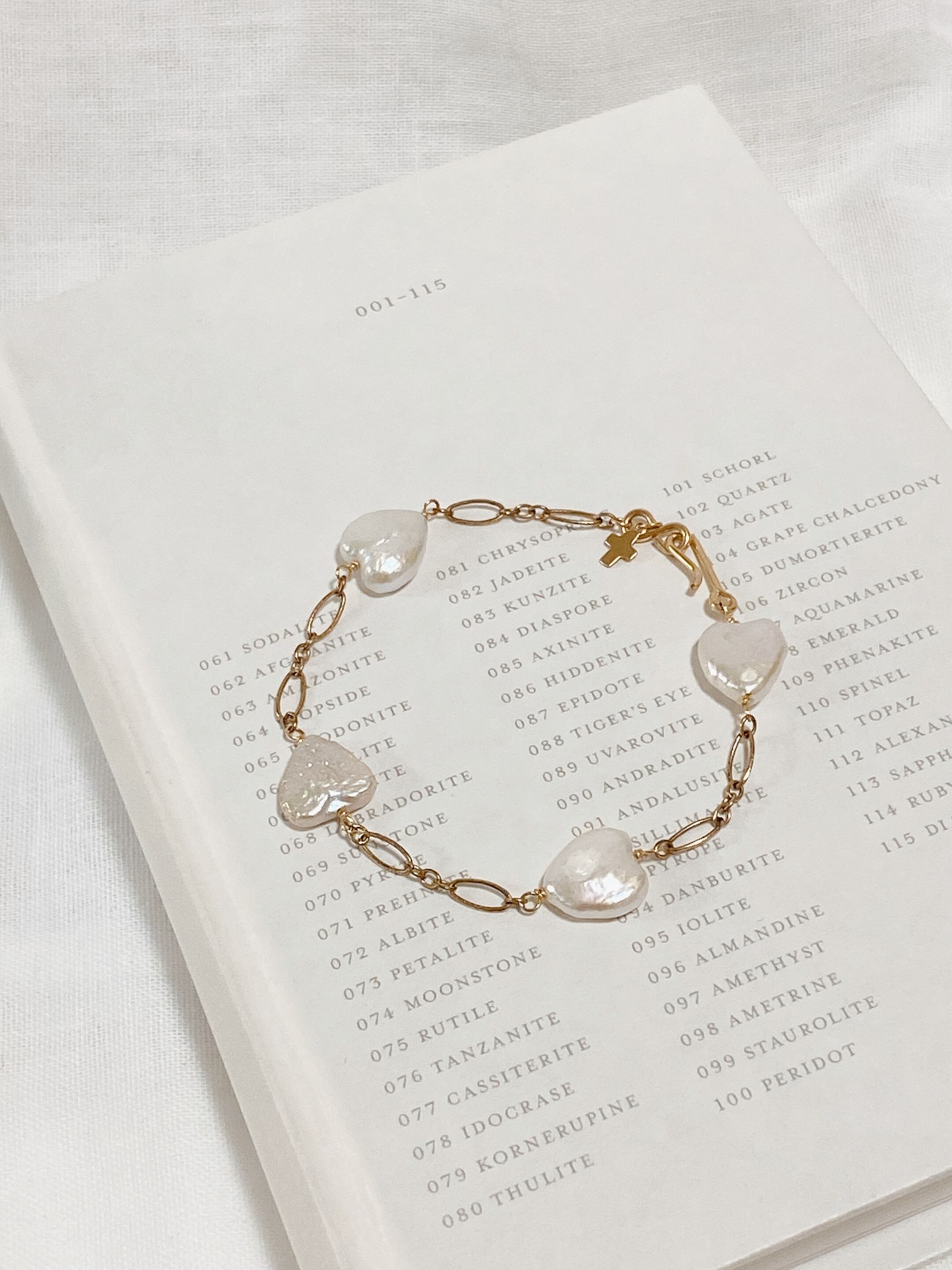 手元を見るたび気分が上がる、ハートシェイプの可愛らしいブレスレット。フックで取り外しやすくも外れにくいのが嬉しいポイント。