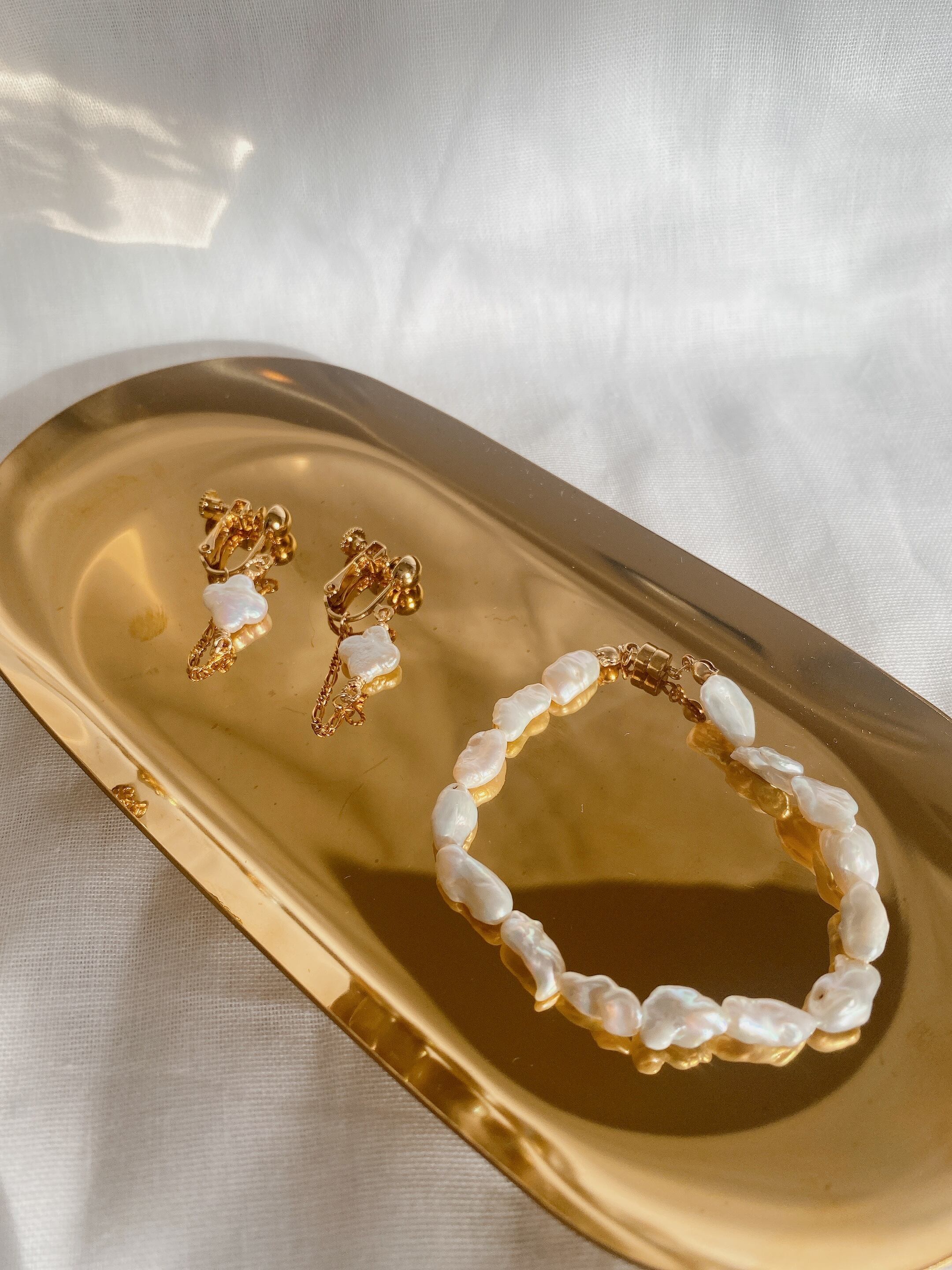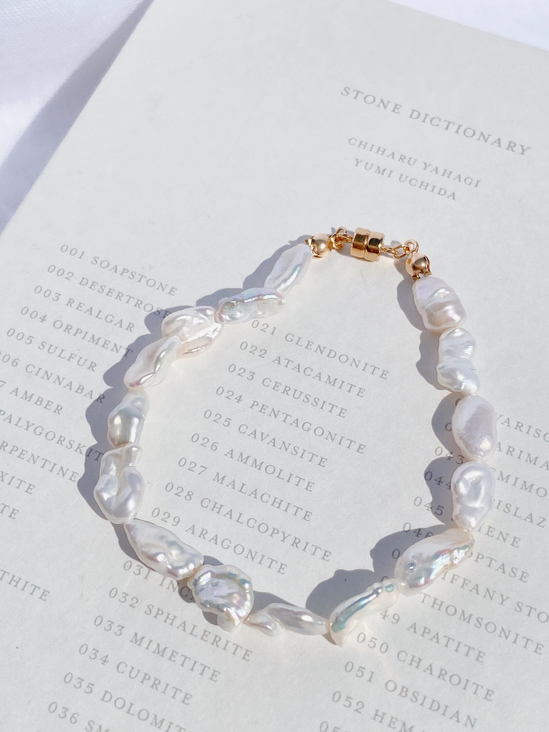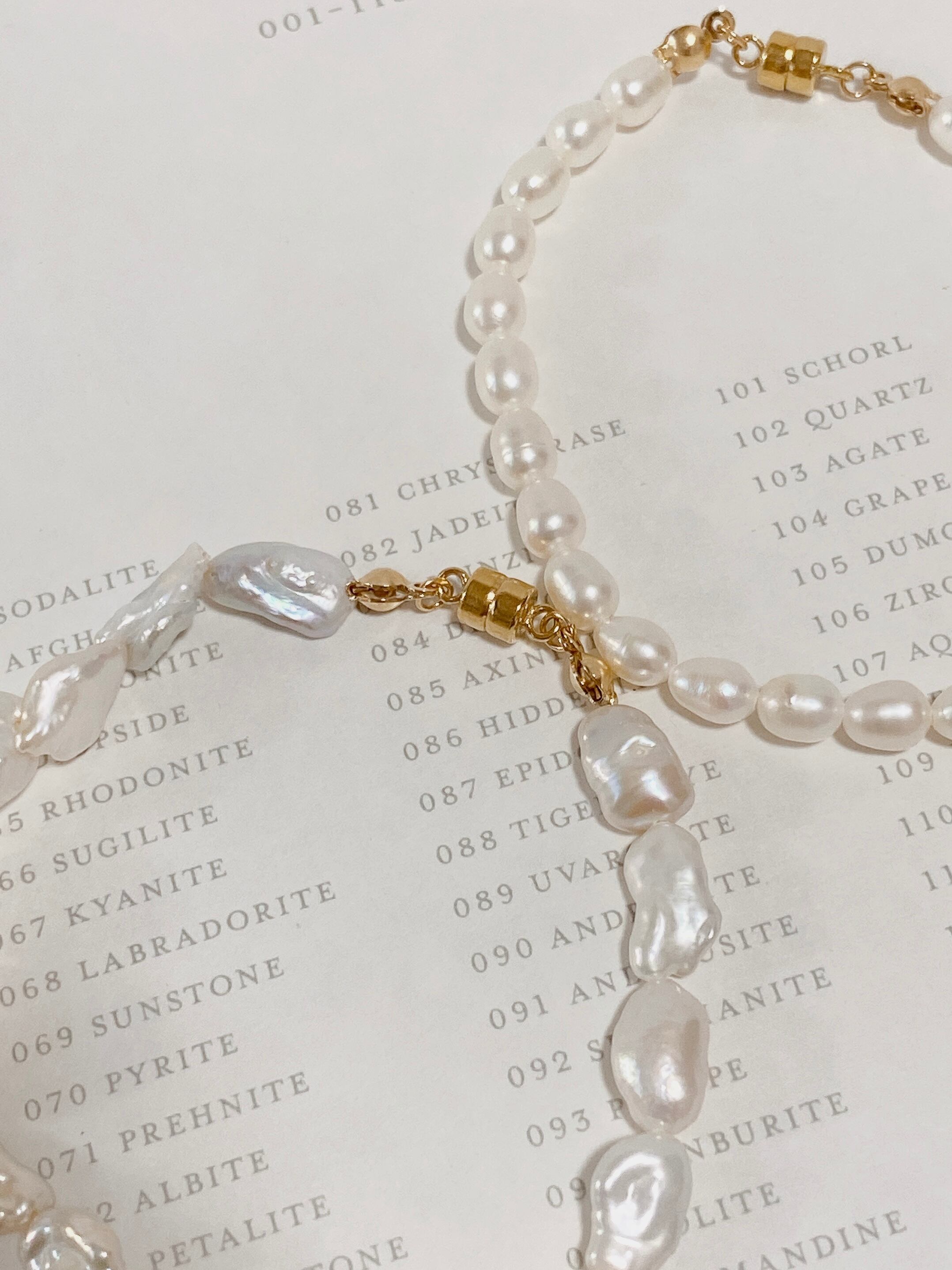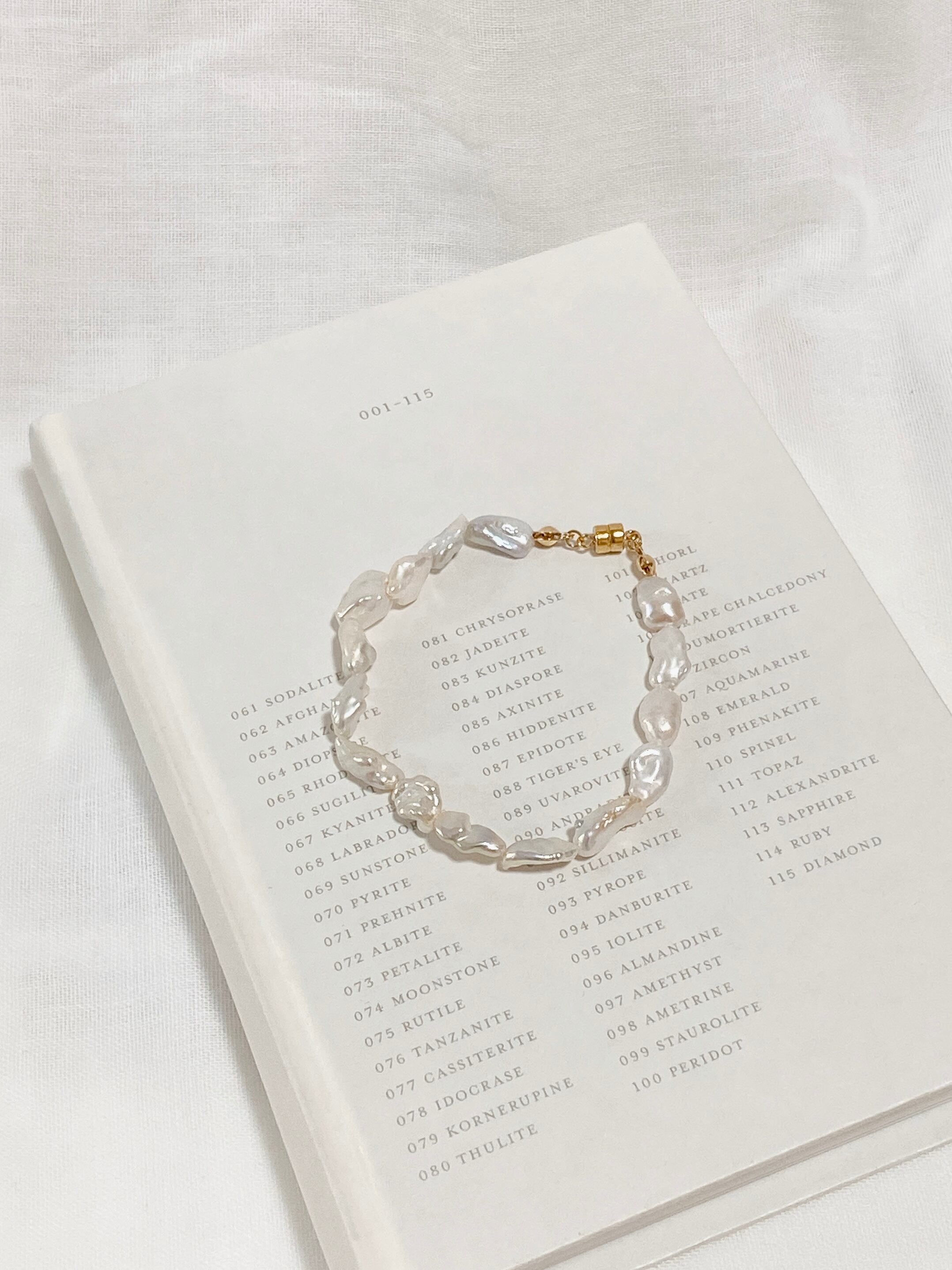 ふぞろいな淡水パールのニュアンスがおしゃれななデザインブレスレット。16cmとぴったりめなサイズ感と、着け外しやすいマグネットがポイントです。爪が長くても着脱できます◎