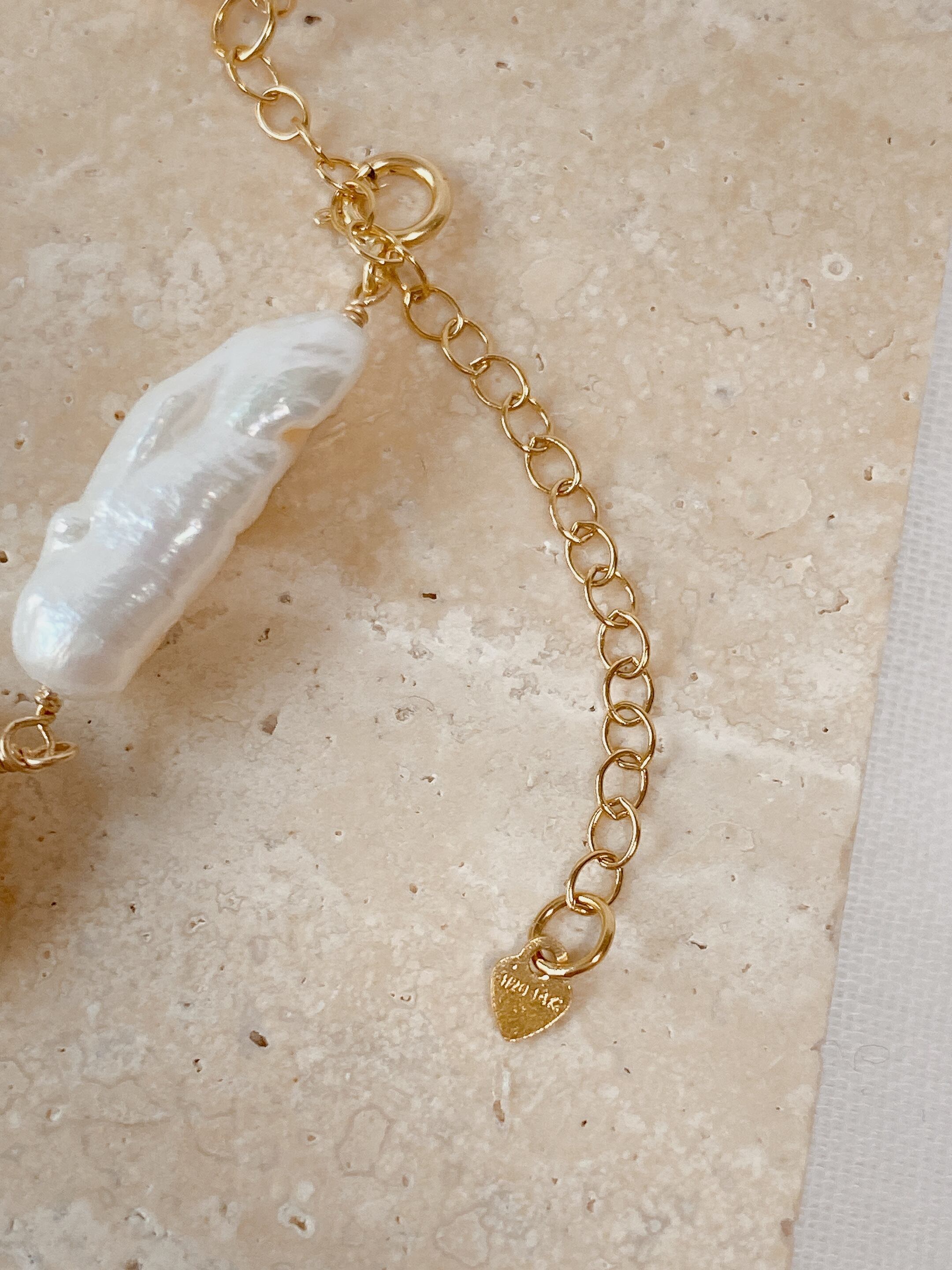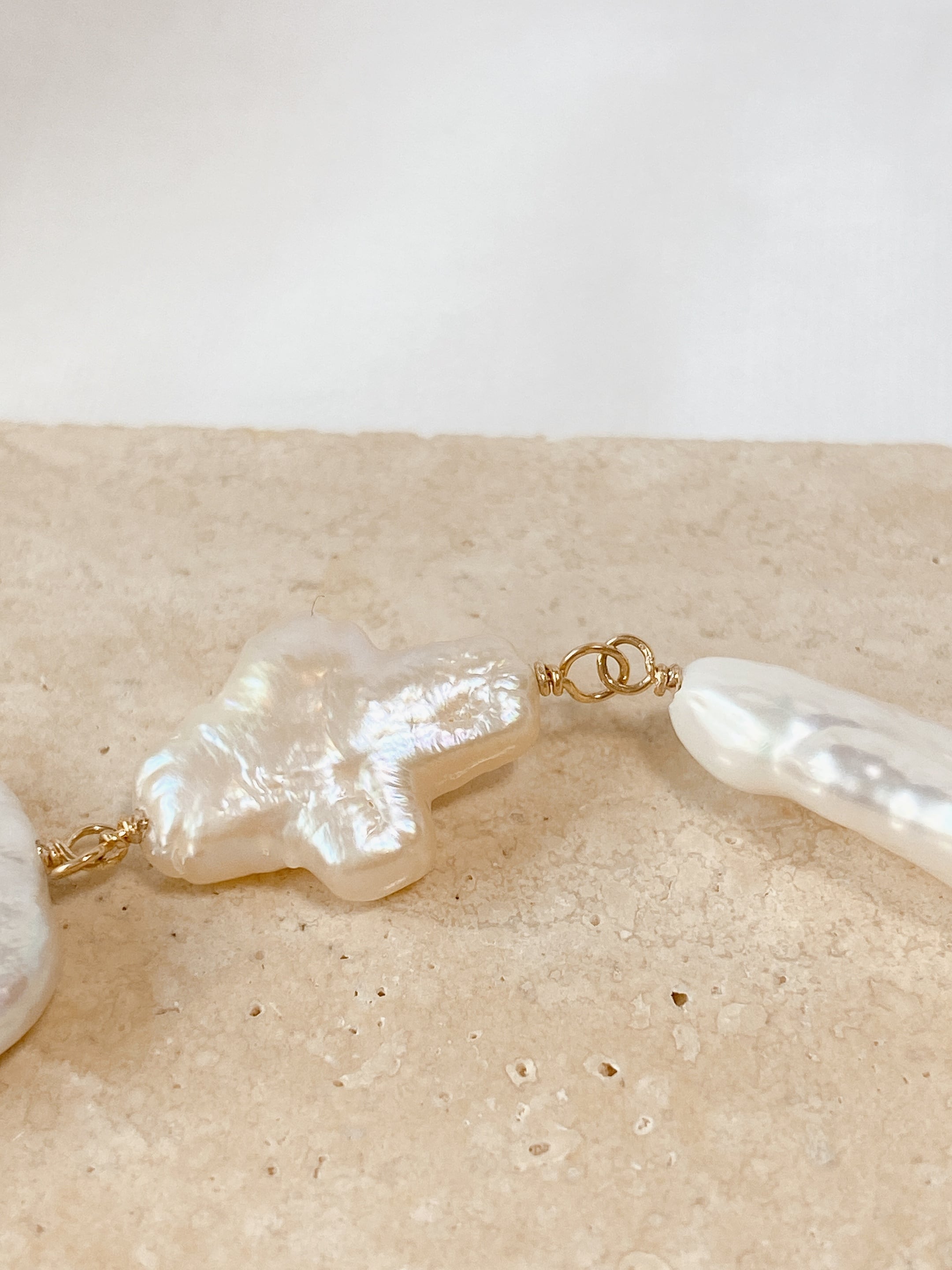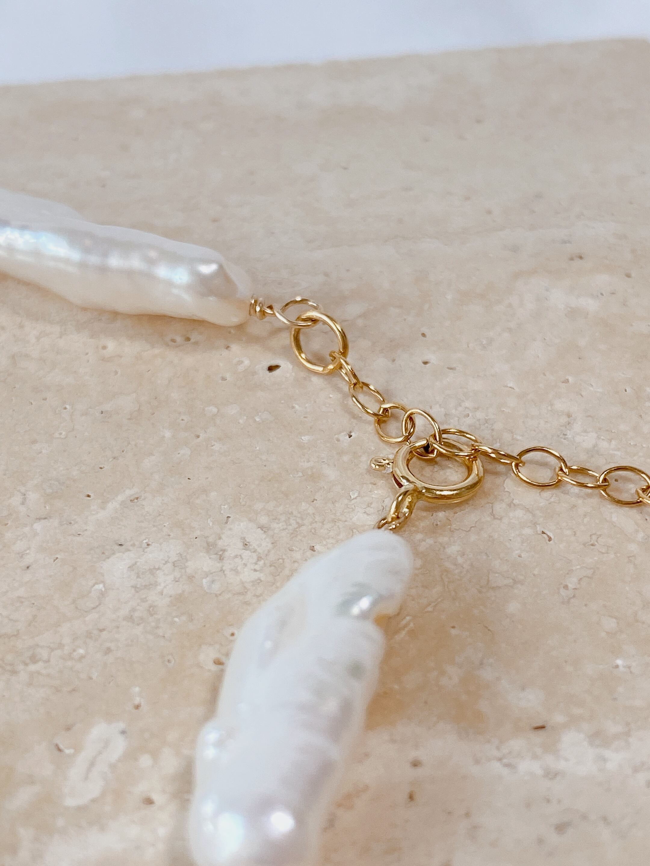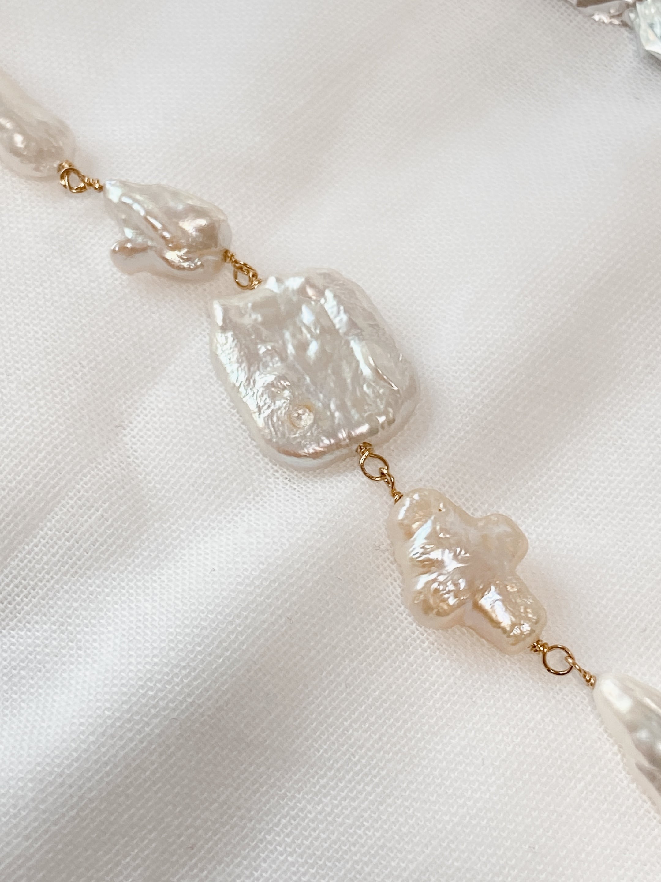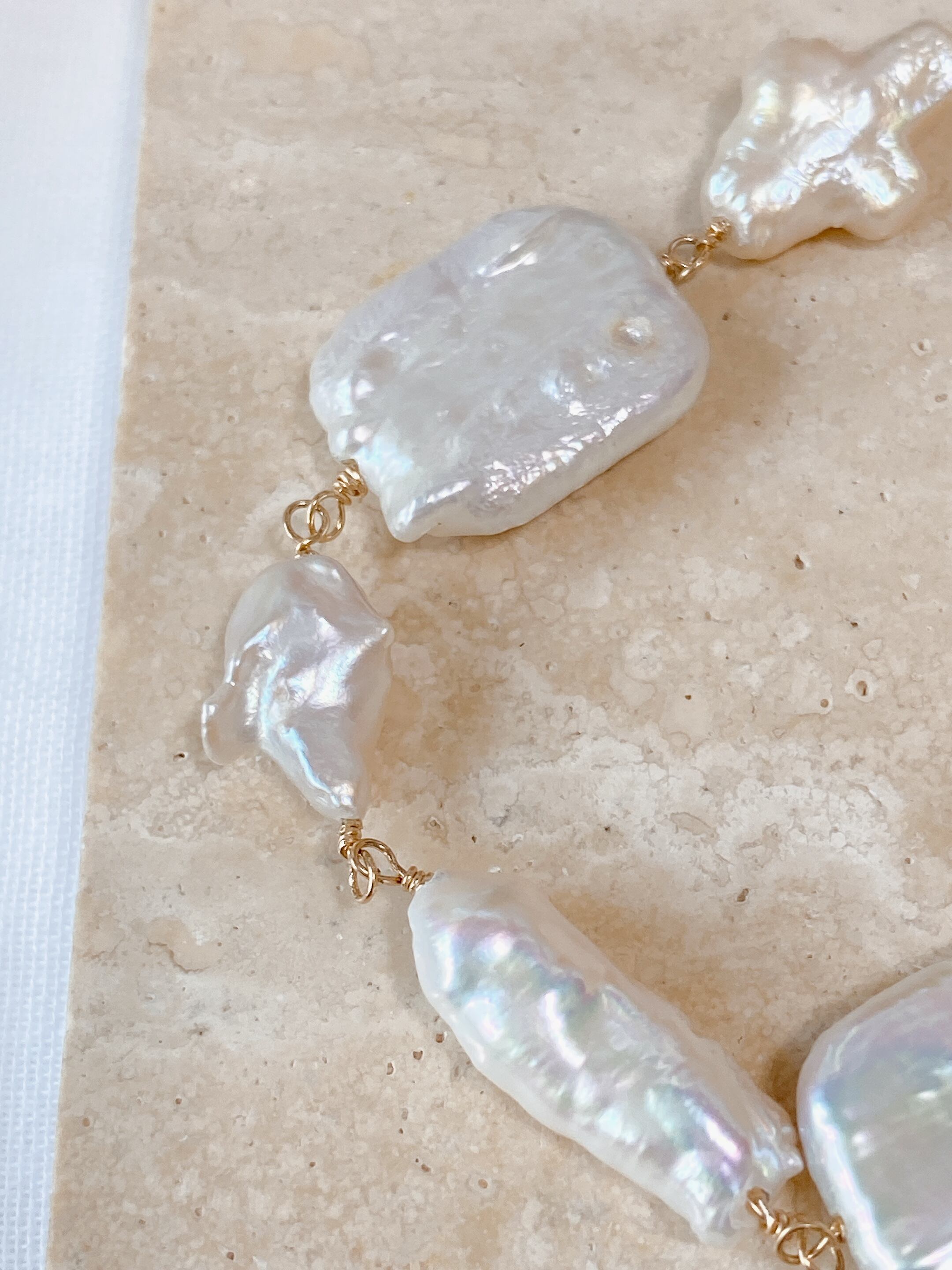 様々な形の淡水パールを並べたブレスレット。少々ゆったり目なサイズ感で、長袖の上からもお楽しみいただけます。他のブレスレットとレイヤードしても、シャツやニットとも相性抜群なアイテム。アジャスターで長さ調節可能です✨