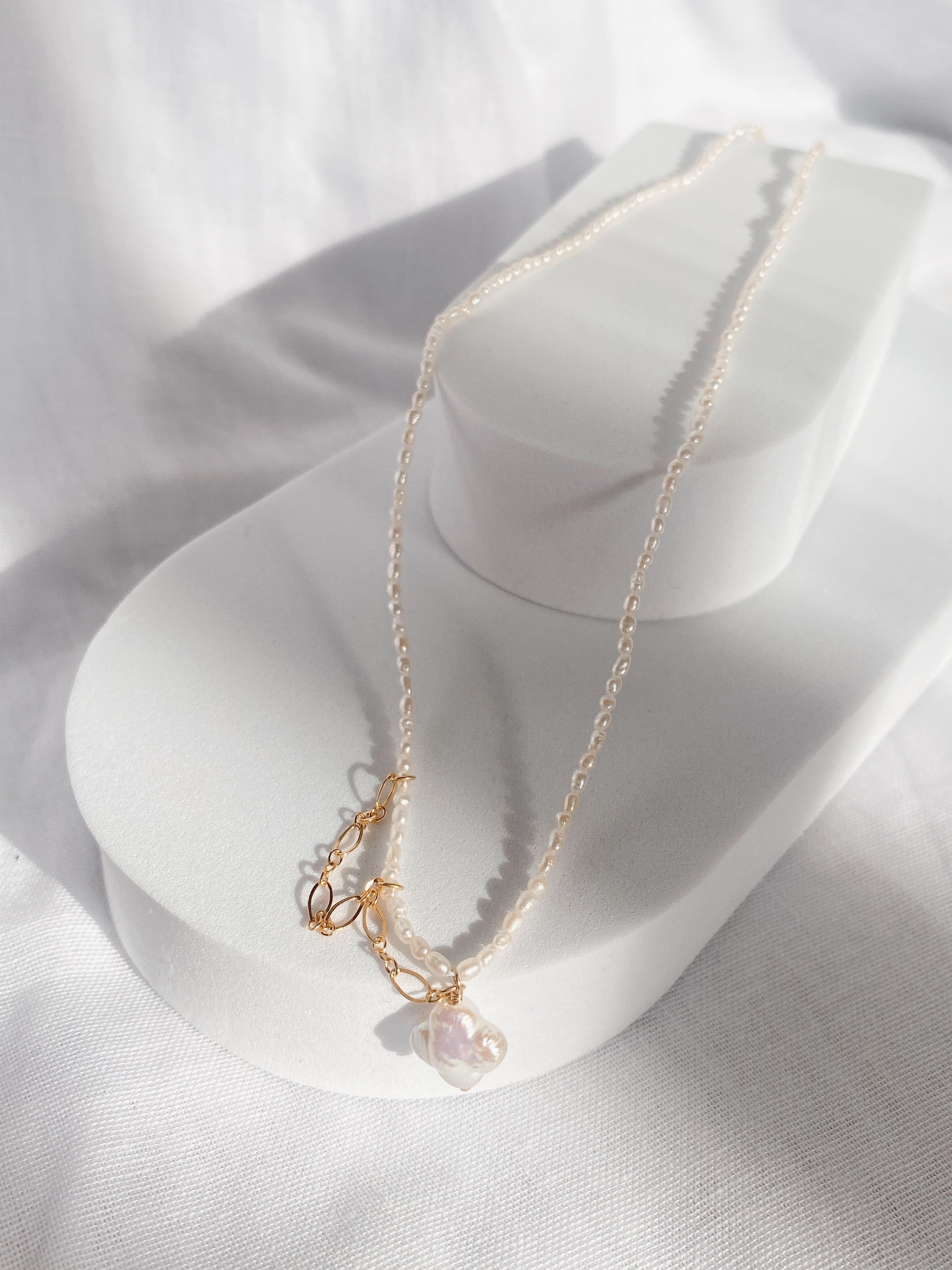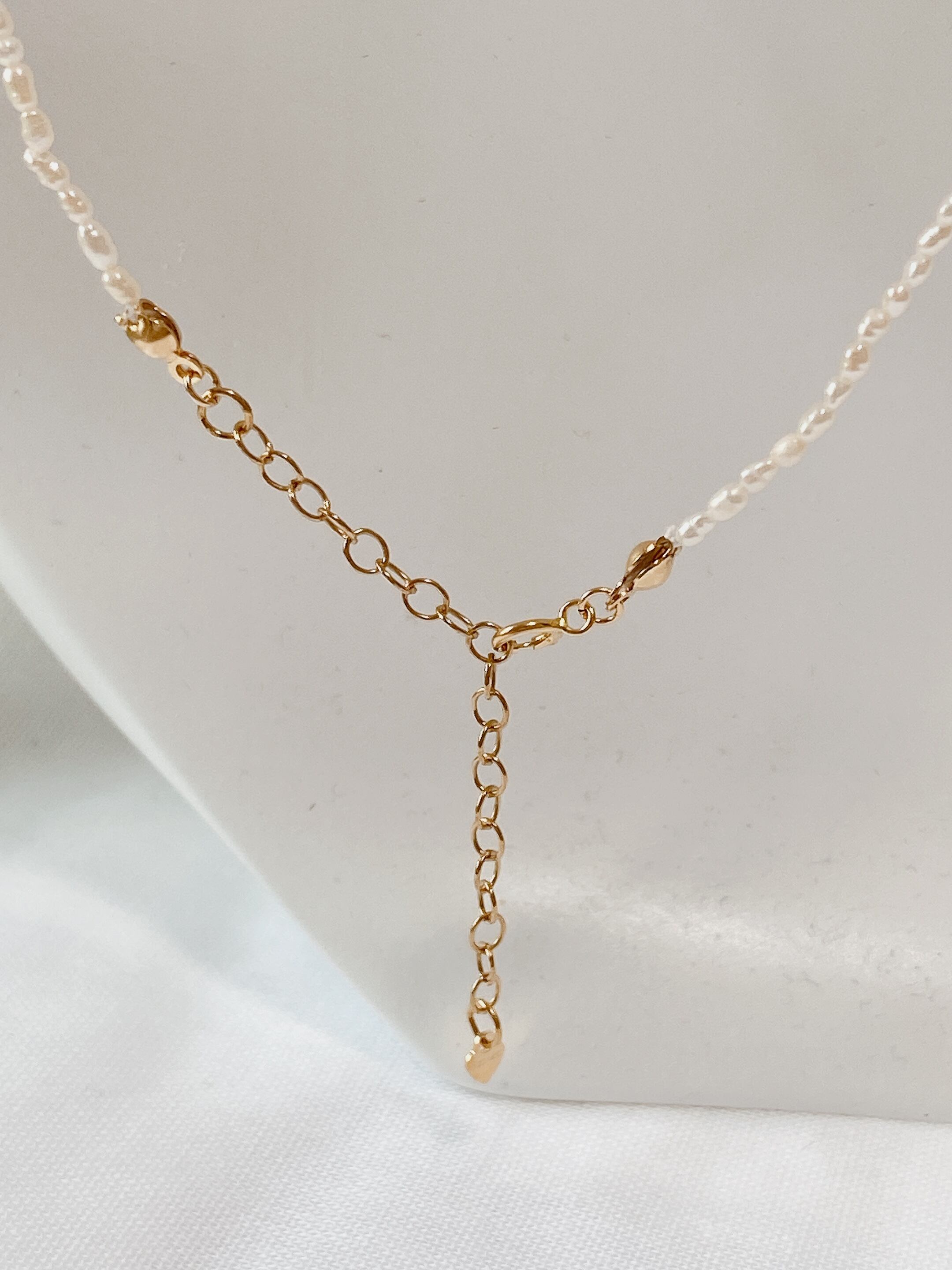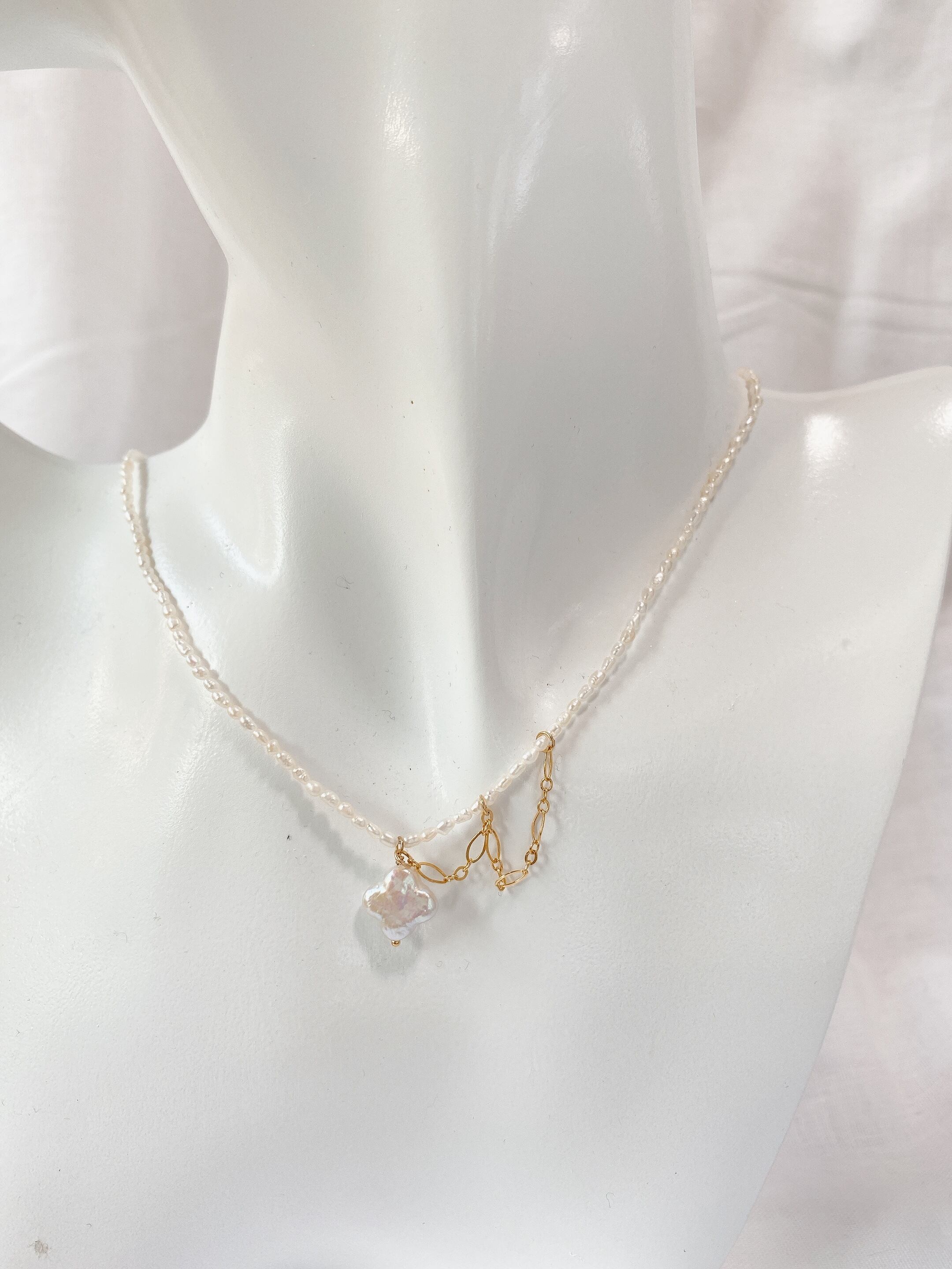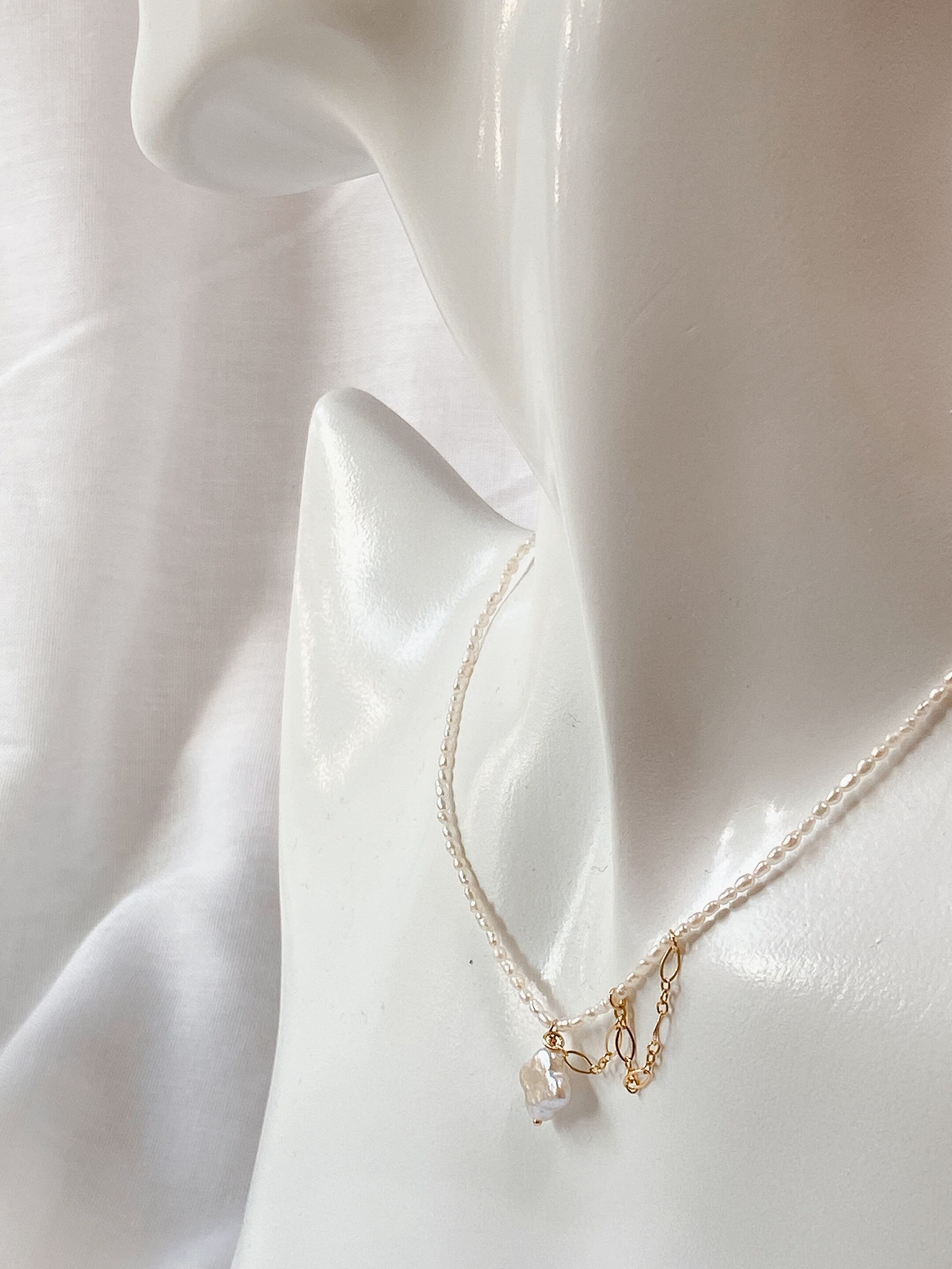 首元を華やかに魅せる細かな淡水パールが美しいネックレス。