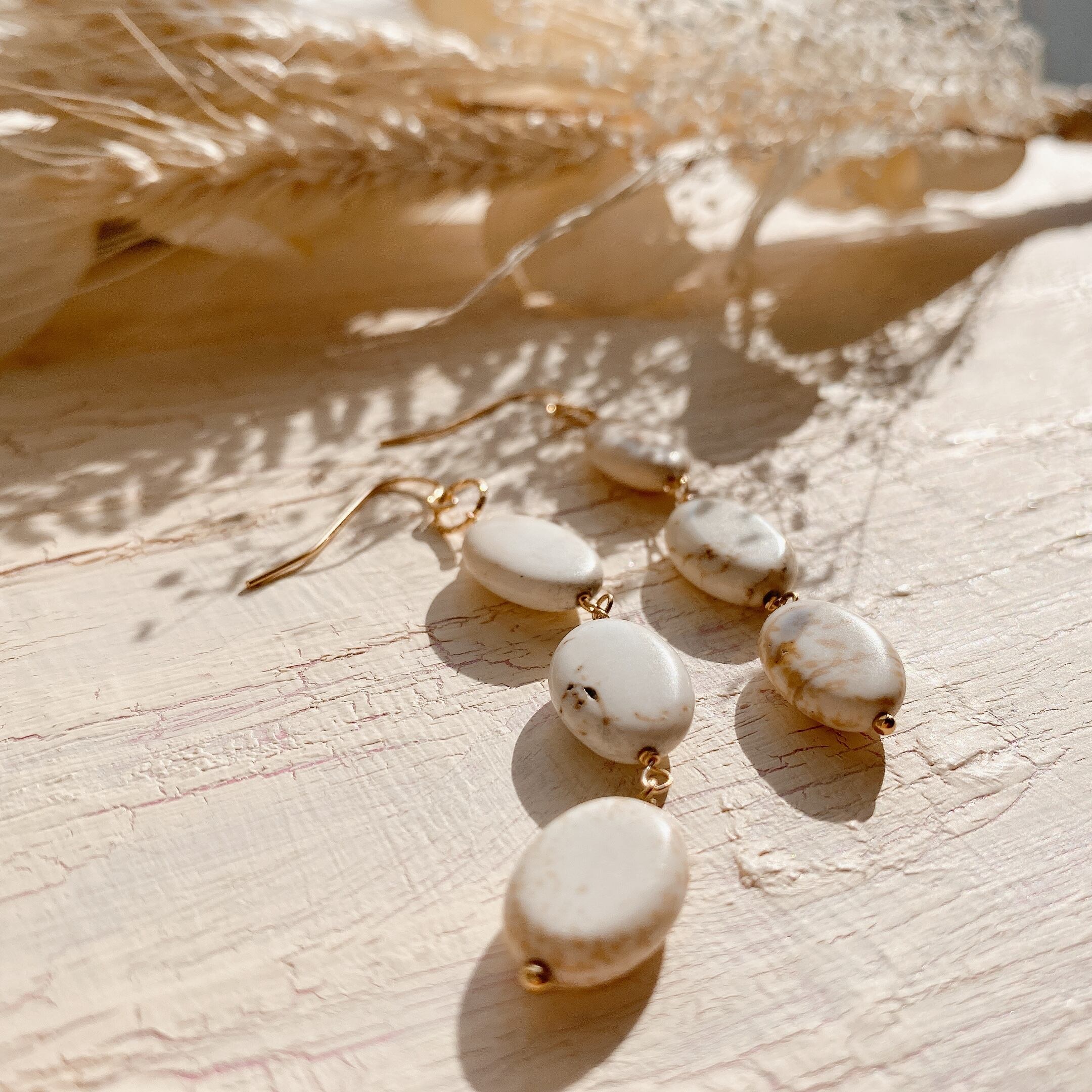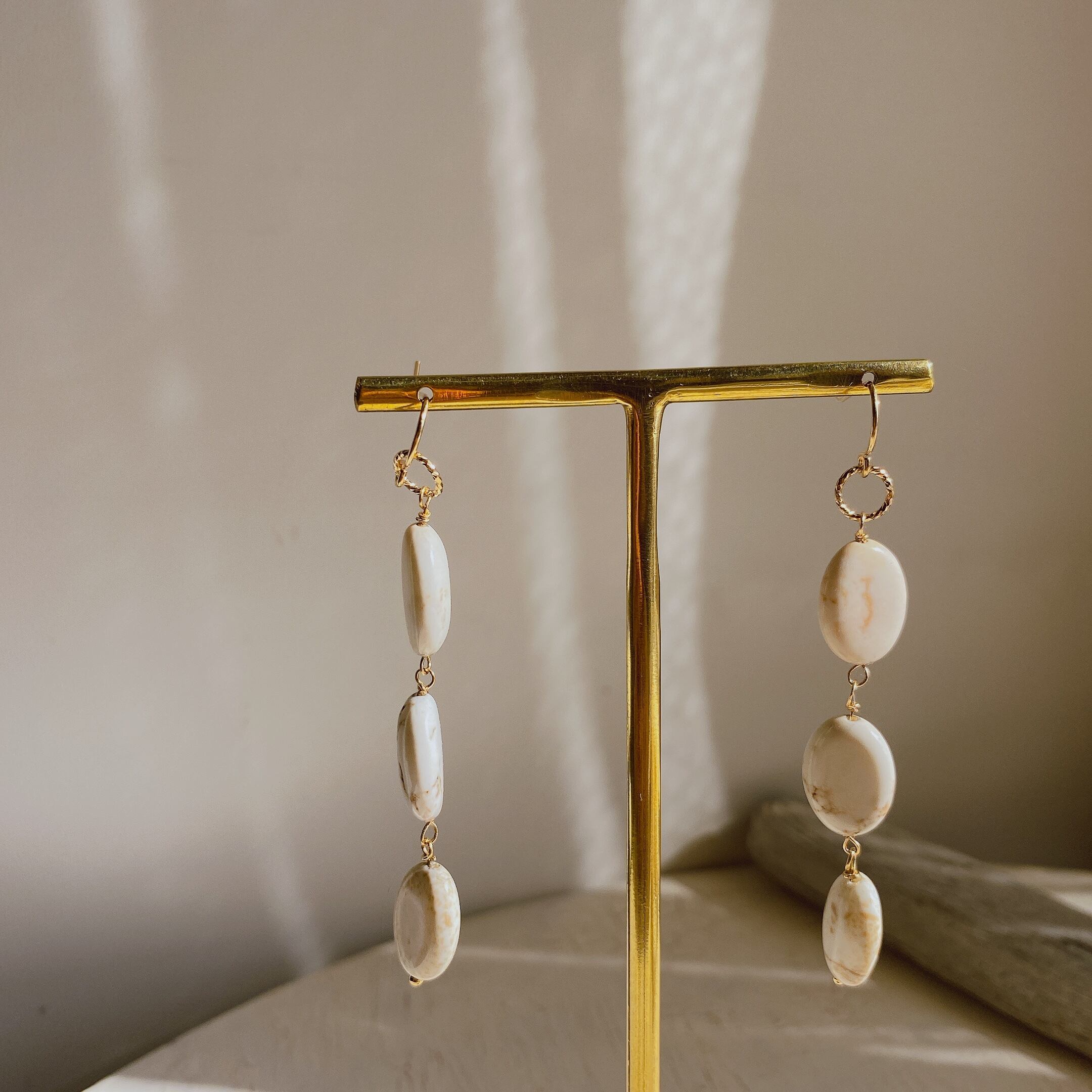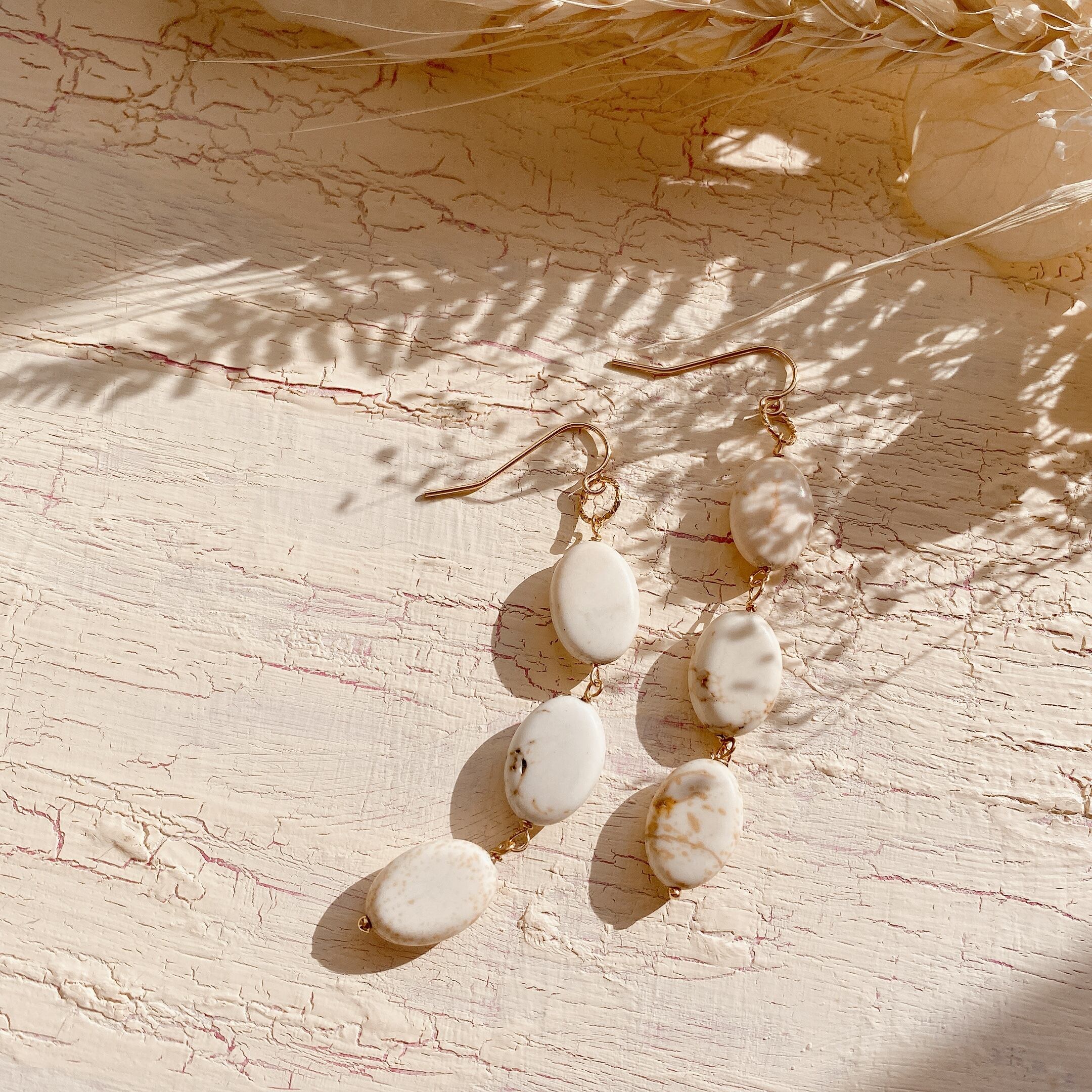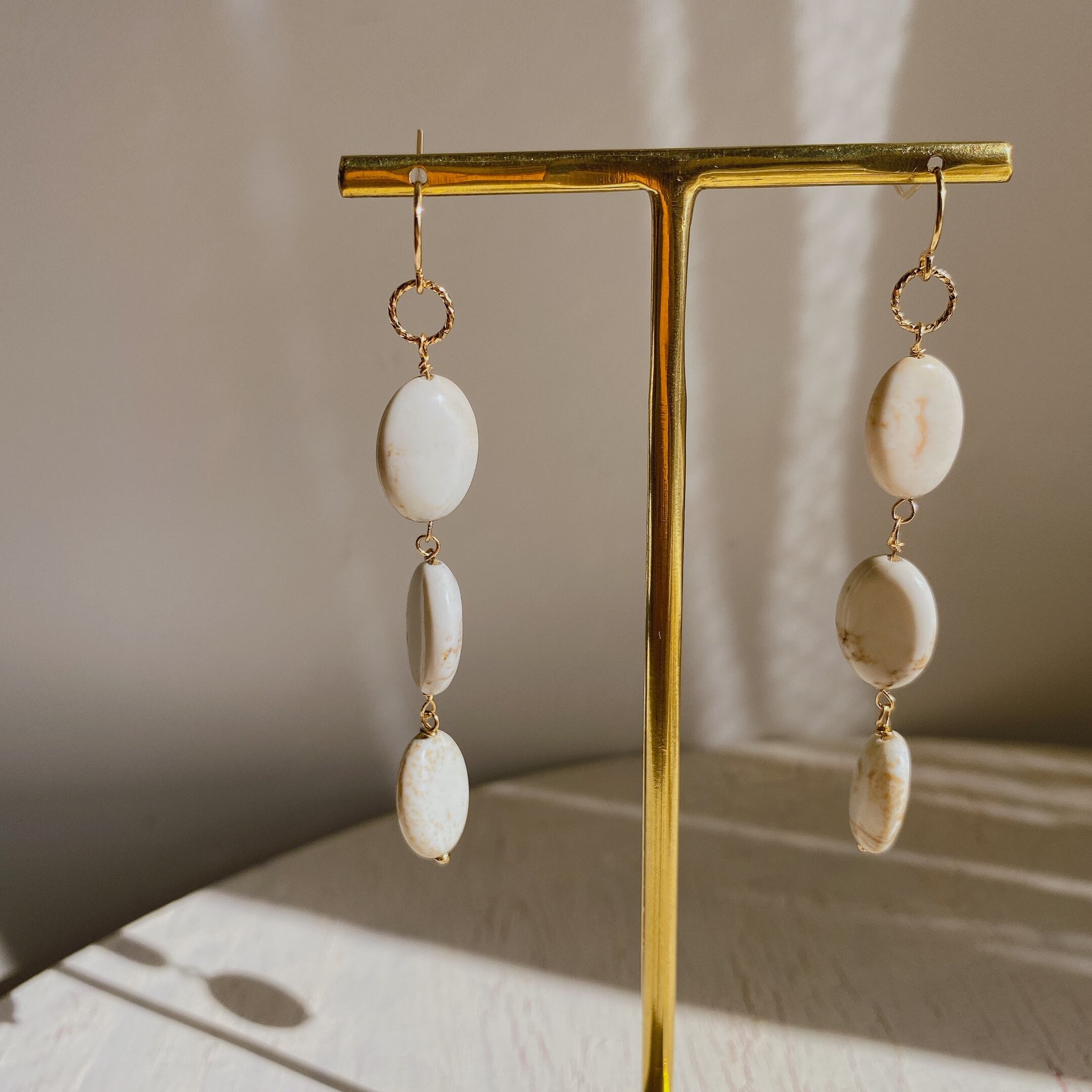couthの代表的なアクセサリー。マットな質感のマグネサイトは、大理石のような模様でカジュアルなのに品よく着けられる石です。