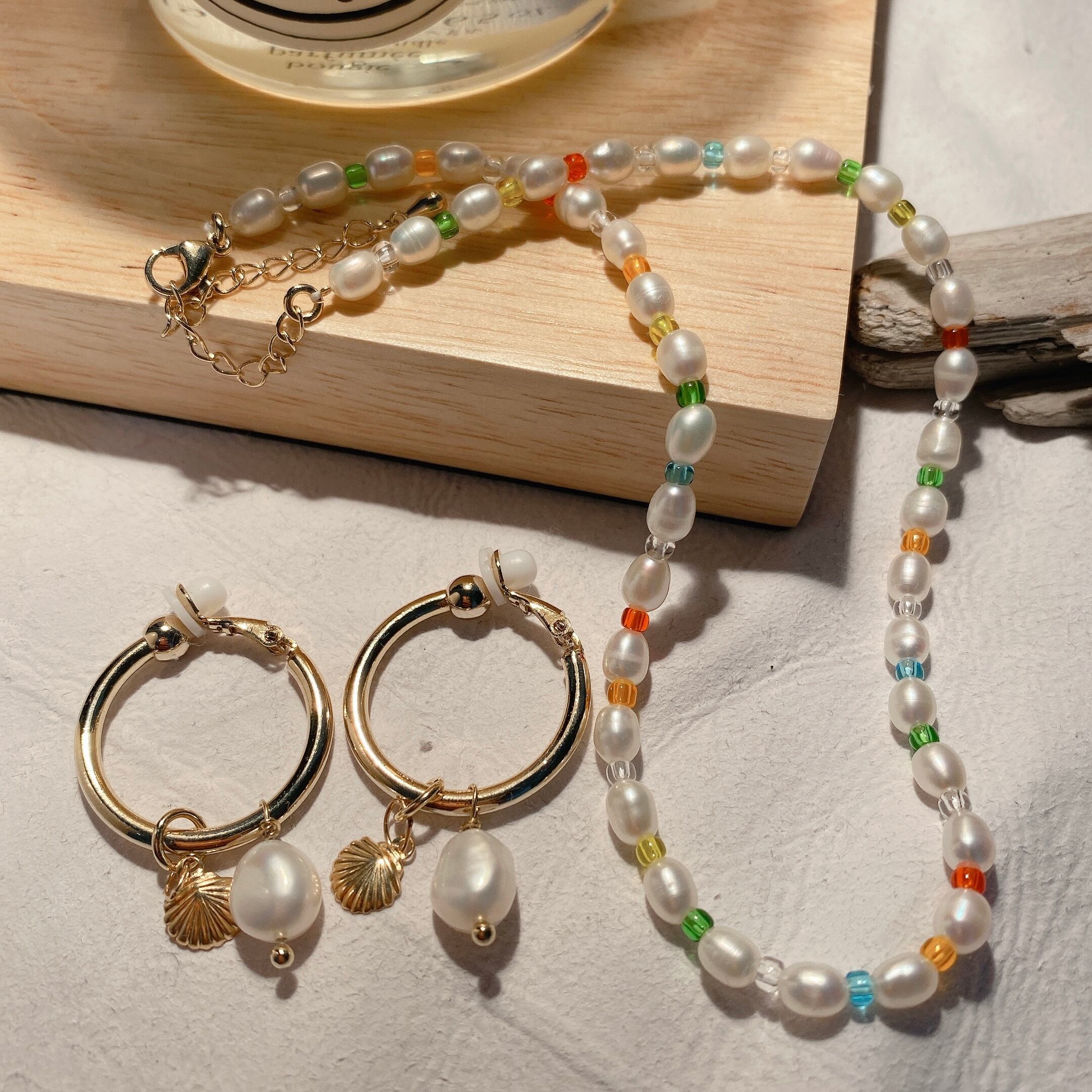 夏を感じるシェルパーツにさりげないパールがおしゃれ。今年もあの海に行けるかな、なんて思いを馳せるイヤリング。ピアスもご用意しております。