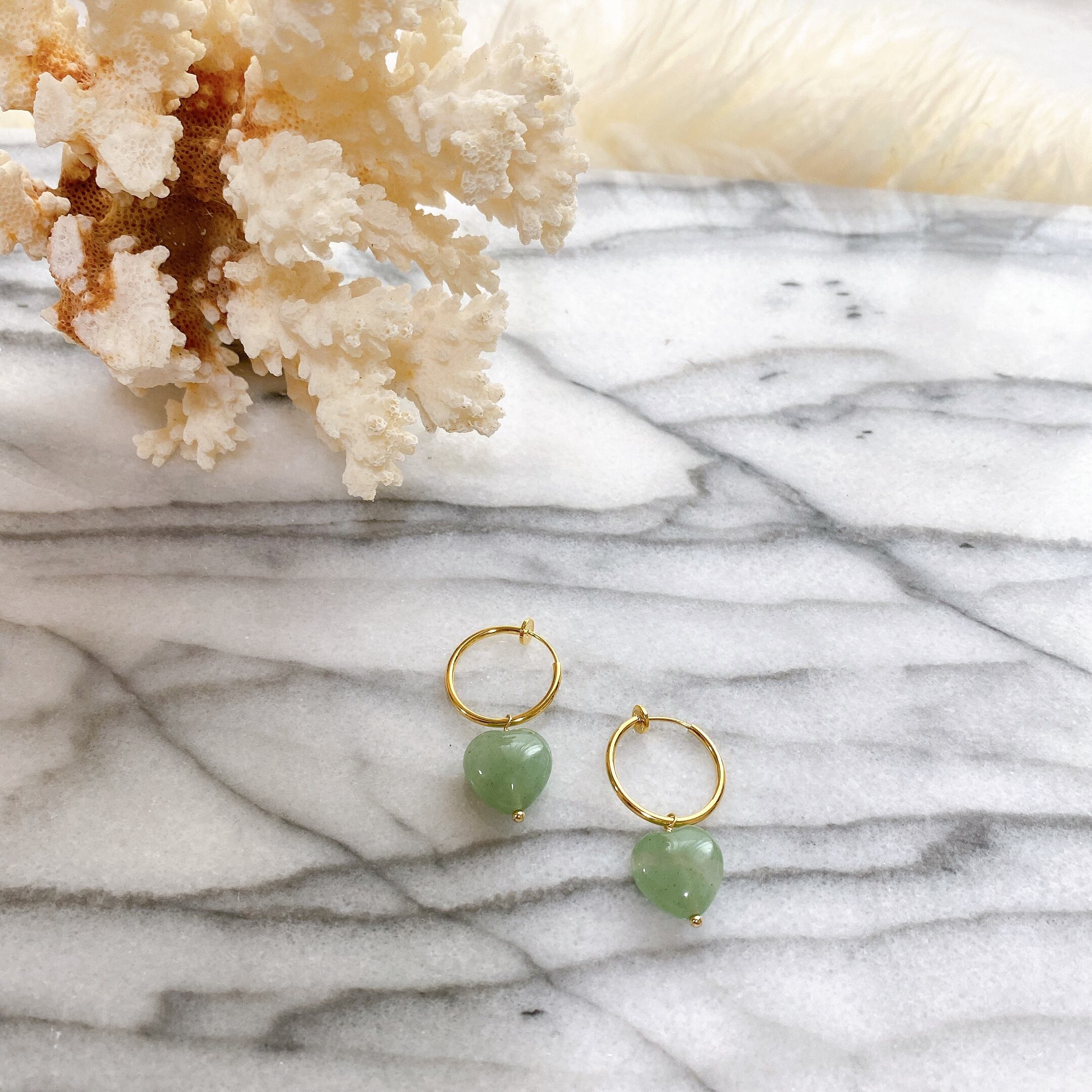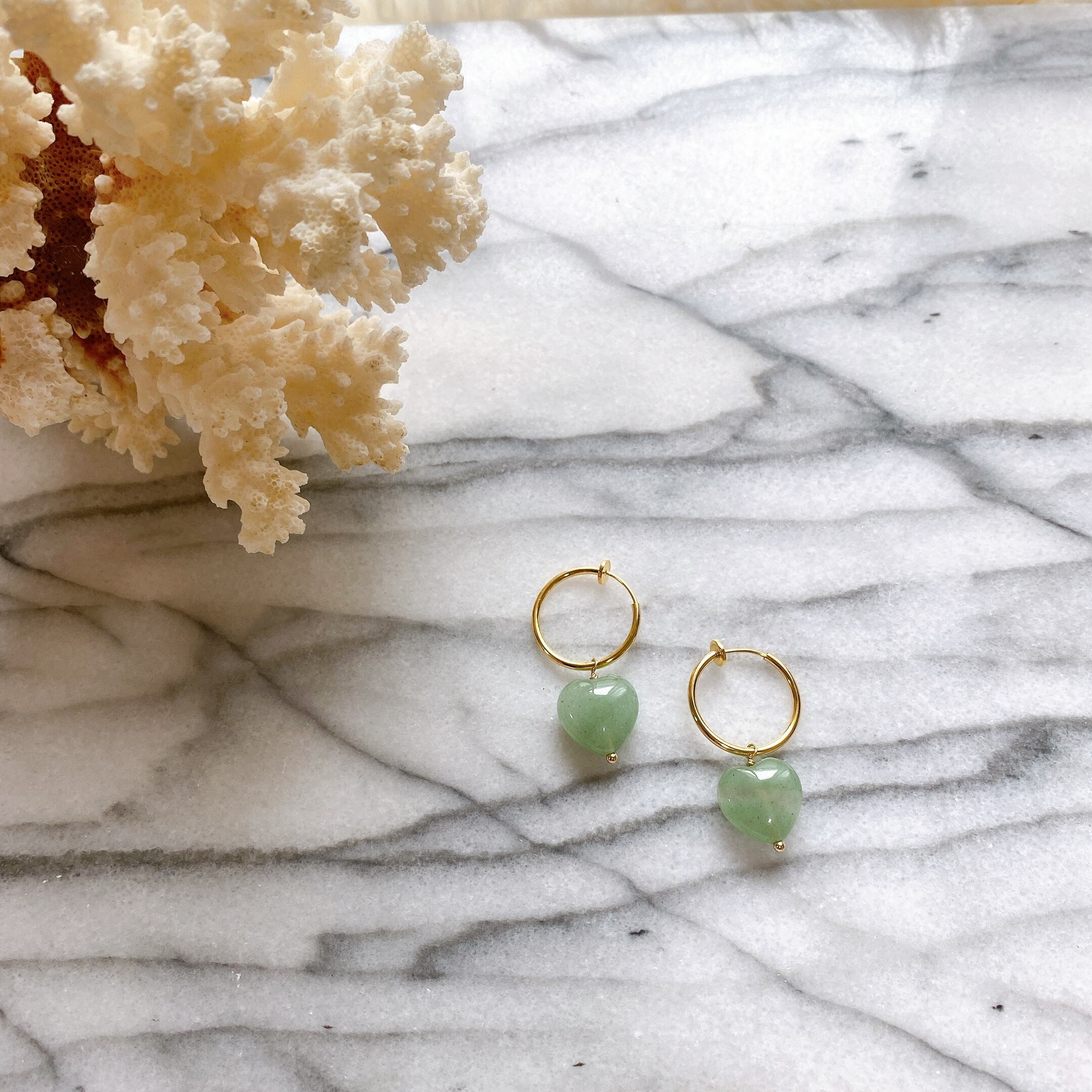 癒し効果のあるグリーンアベンチュリンの石言葉は"恋のチャンス"。秋冬コーデにきっと似合う、可愛らしいデザインのフープピアスです。