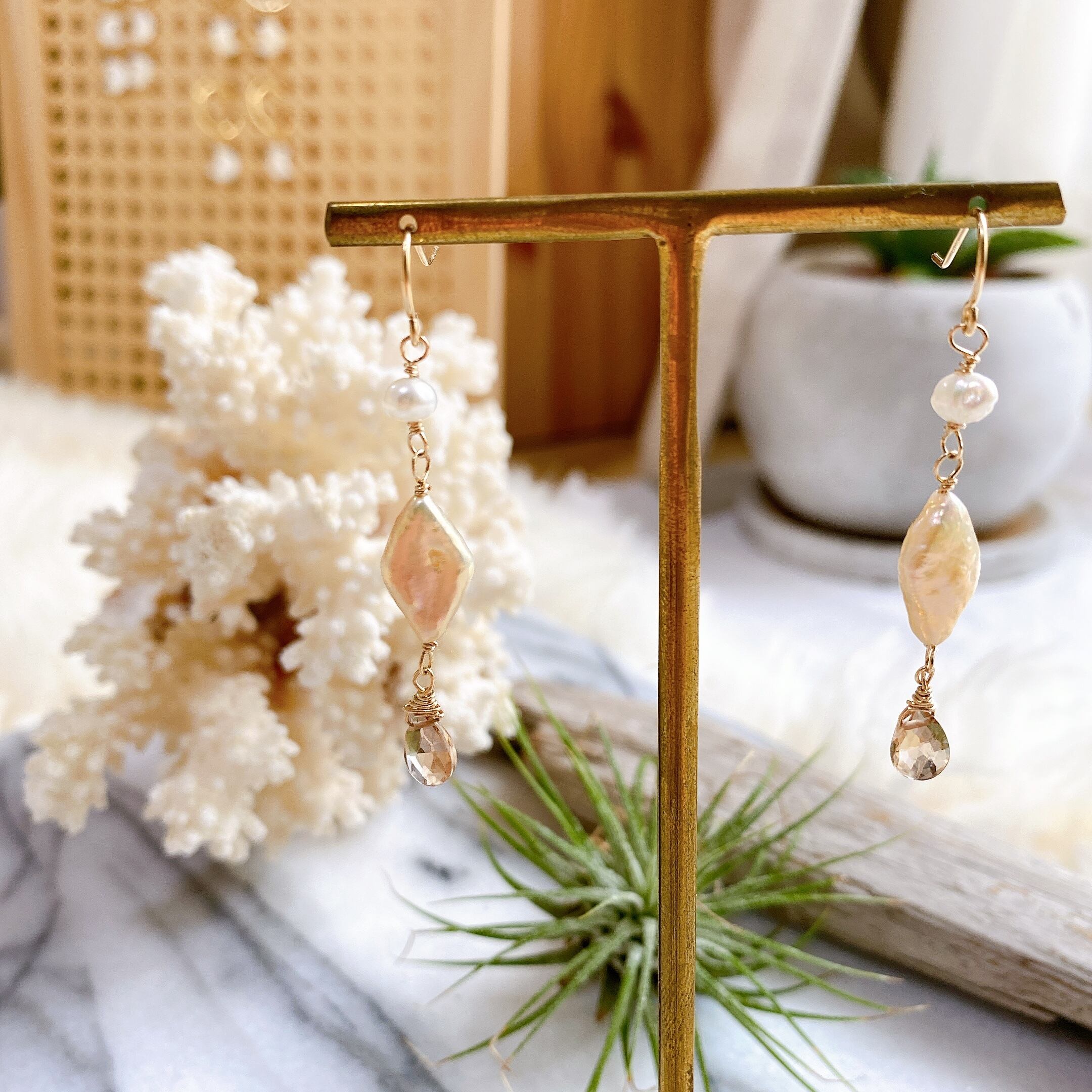 淡水パール×ブラウントパーズ3連ピアス(イヤリング)