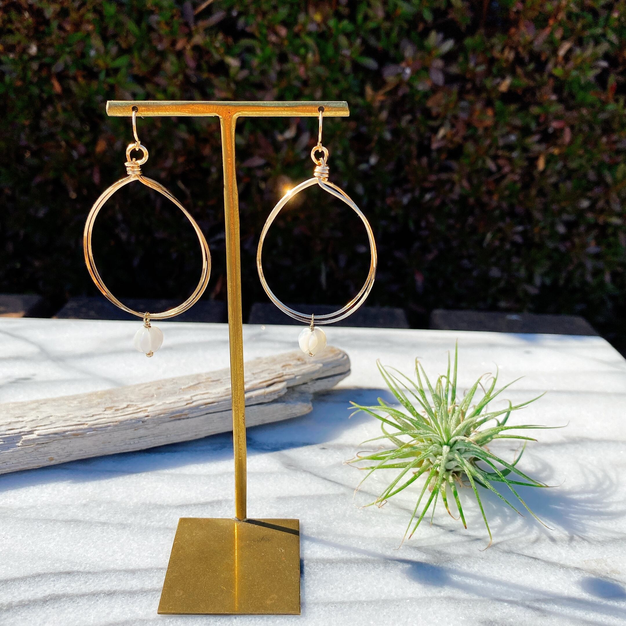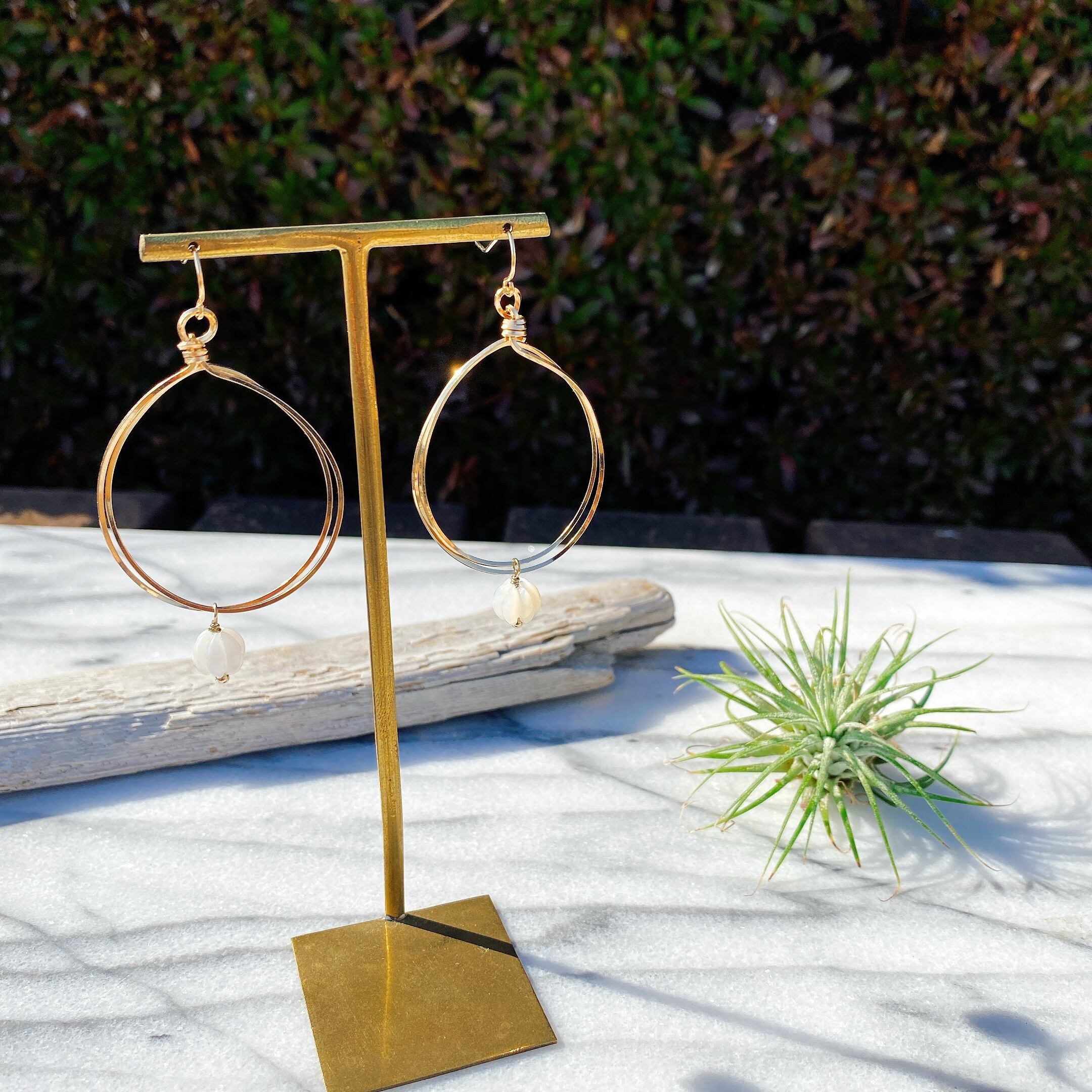 ゆらゆら揺れる様が可愛らしいイヤリング。モードなゴールドフープにパンプキンシェイプのホワイトシェルをプラスしてマイルドに仕上げました。